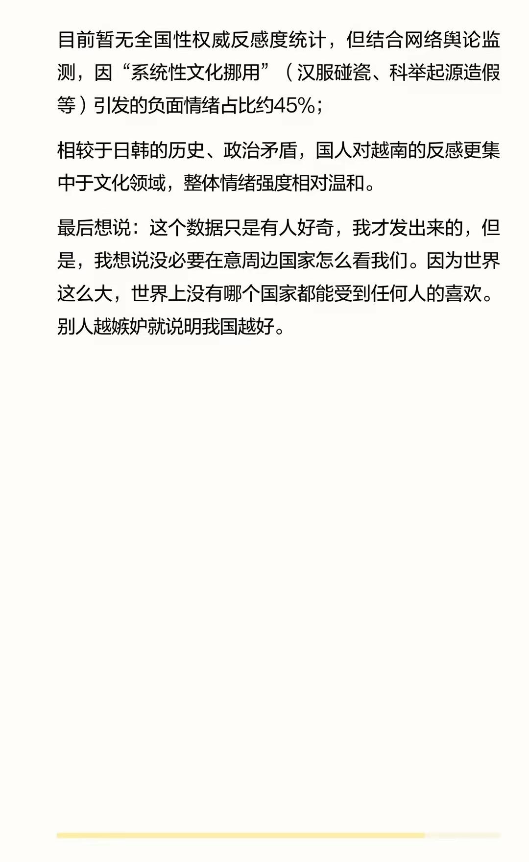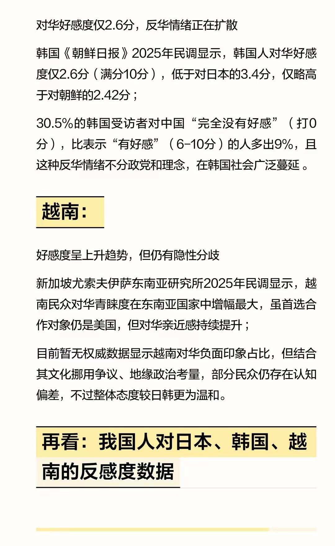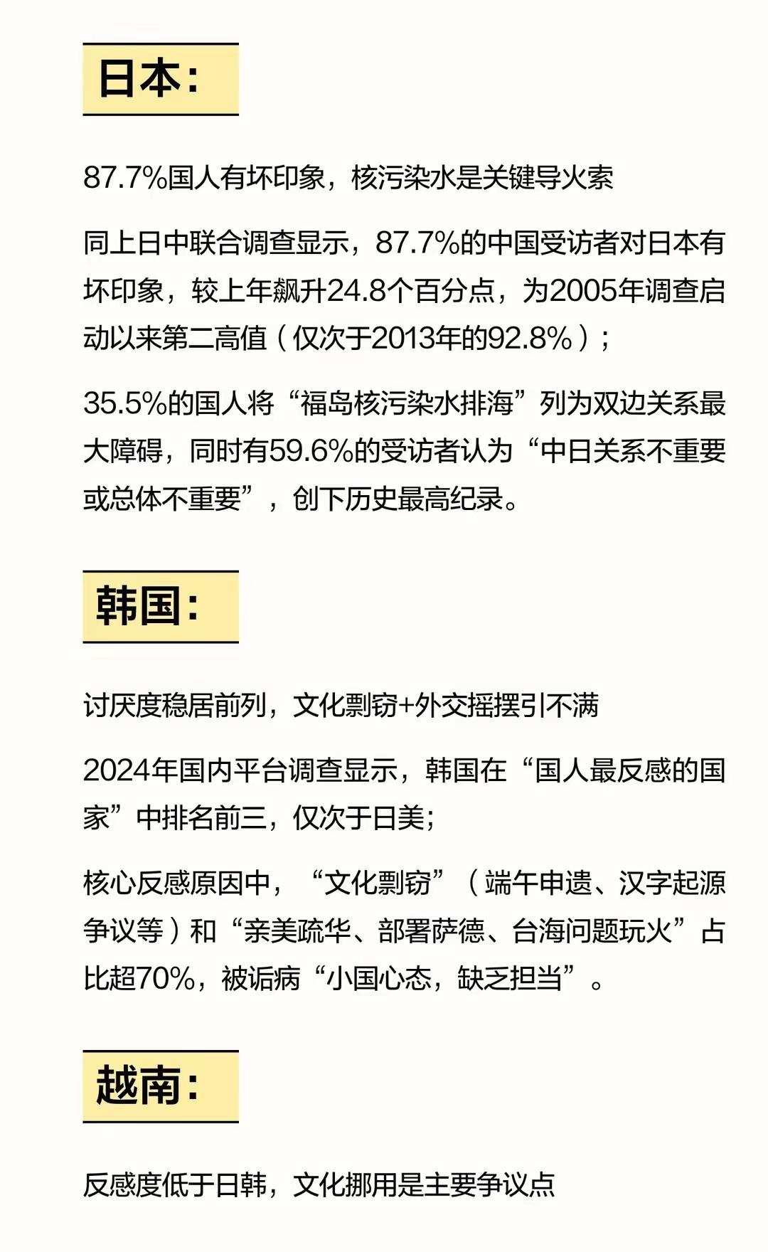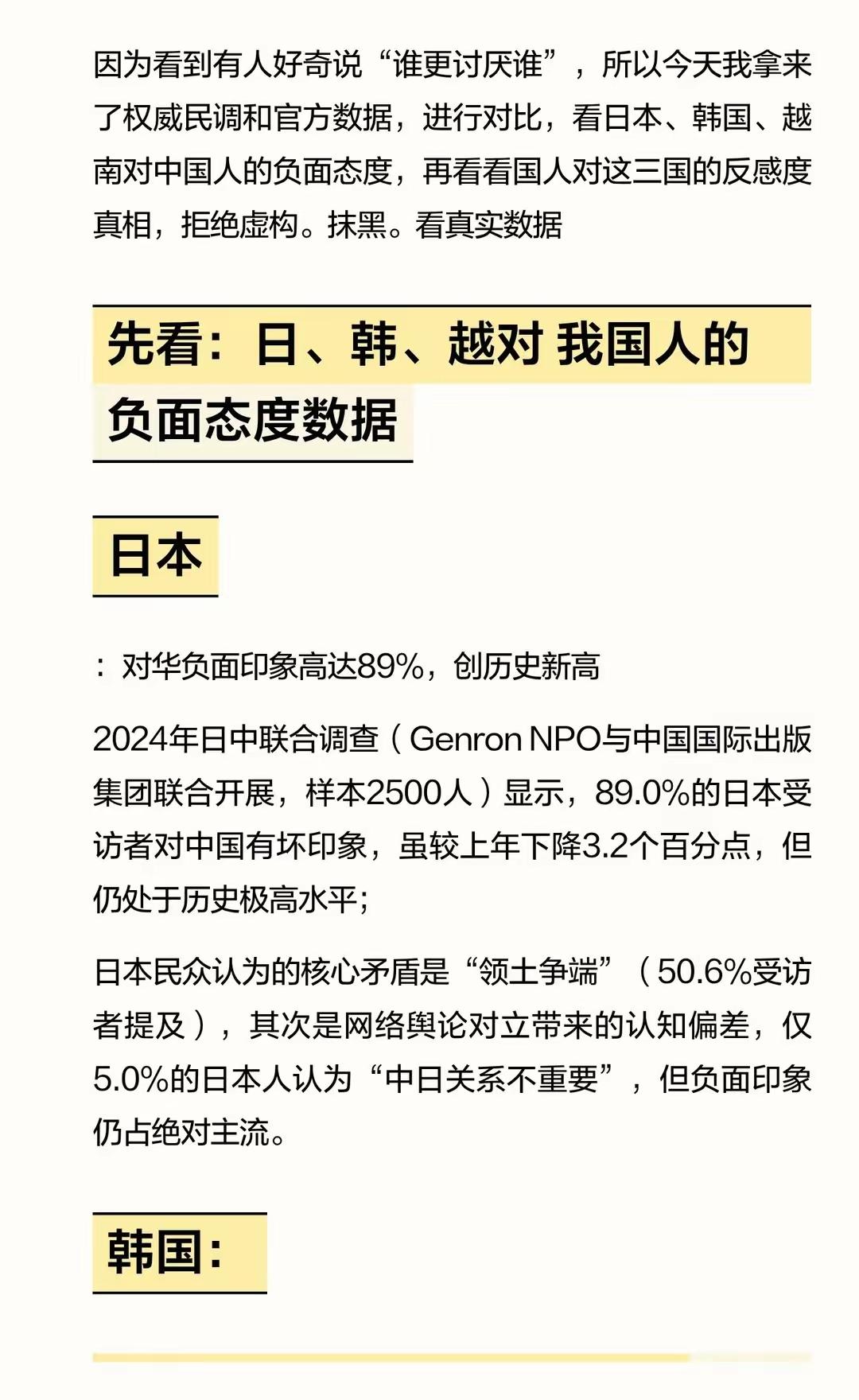 中日互厌度数据曝光!日本对华负面印象89%,中国对日负面印象87.7%。中国人反感日本有依有据,但日本人对中国反感就是小人之心,也是伤中国最深。 中日反感程度,实质是外来西方文化与本地发展空间(儒家文化)的矛盾纠结。虽然各自都有理,但是,长远来看,恰好也被外来者极尽可能用来制衡,限制了我们的发展潜能。 大家对此怎么看?欢迎在评论区留言,共同交流探讨!