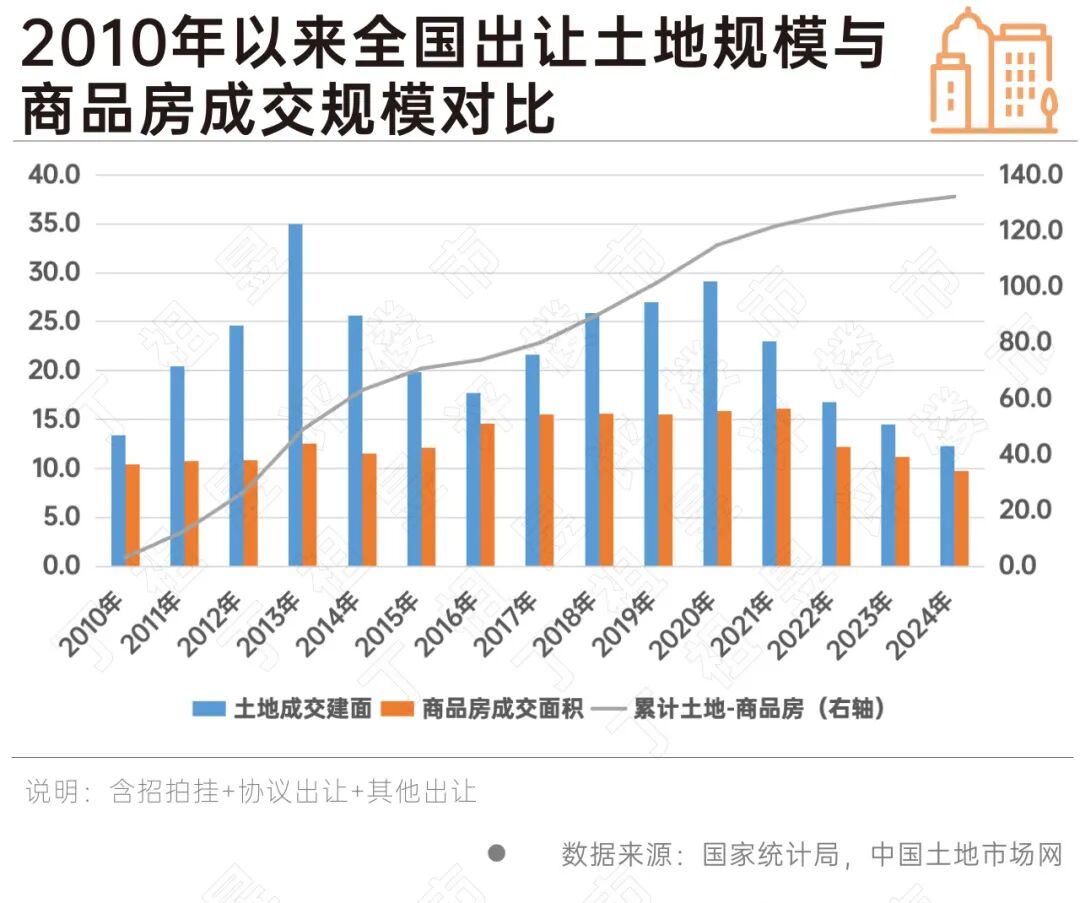 2010年至今,全国出让商品房用地的规划建筑面积为326.9亿平方米,累计成交新建商品房面积194.6亿平方米,两者差值约为132.3亿平方米。