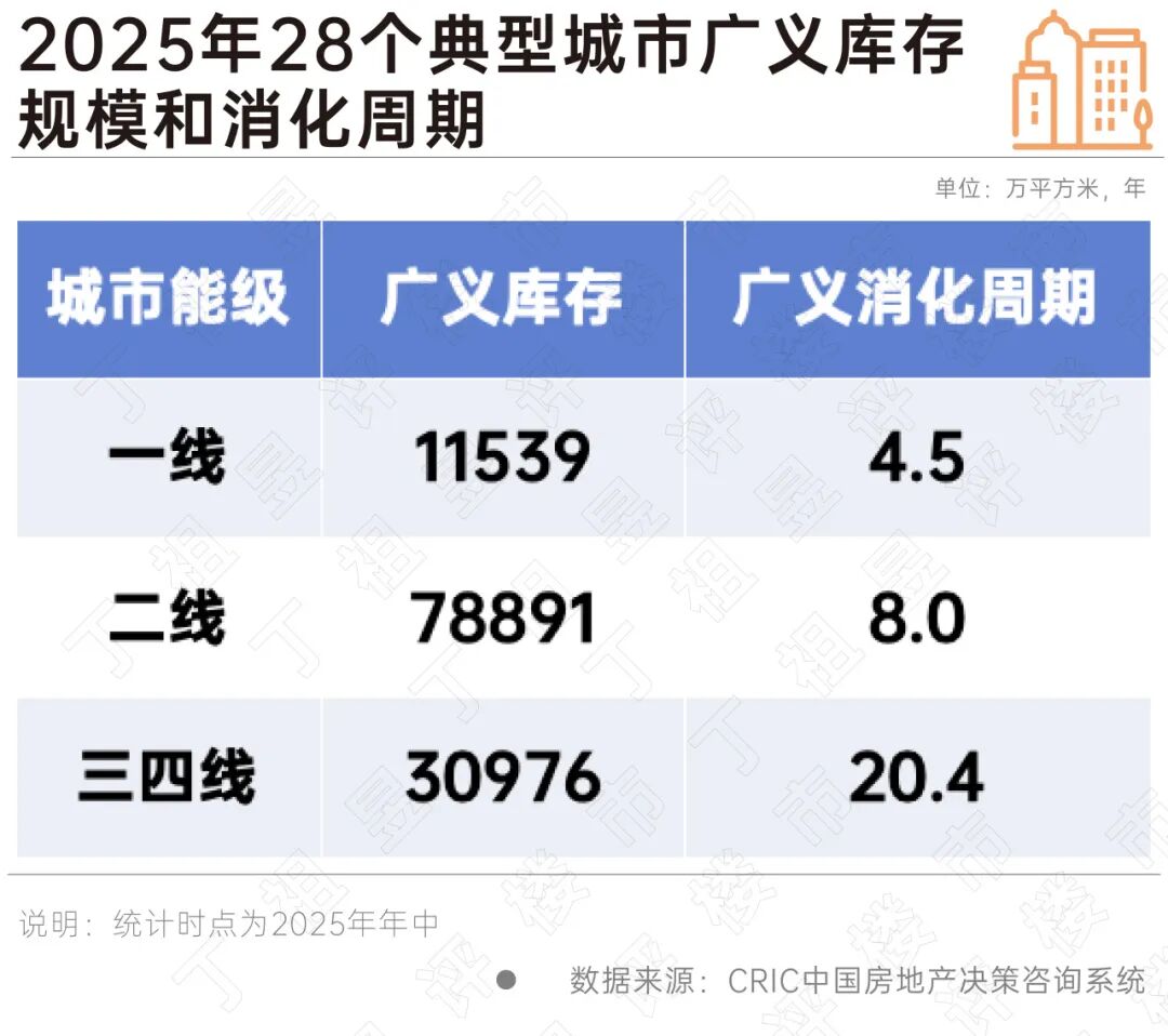 各能级城市库存规模差异显著,一线城市平均广义库存消化周期仅有4.5年,为各能级城市最低,二线城市平均为8.0年。