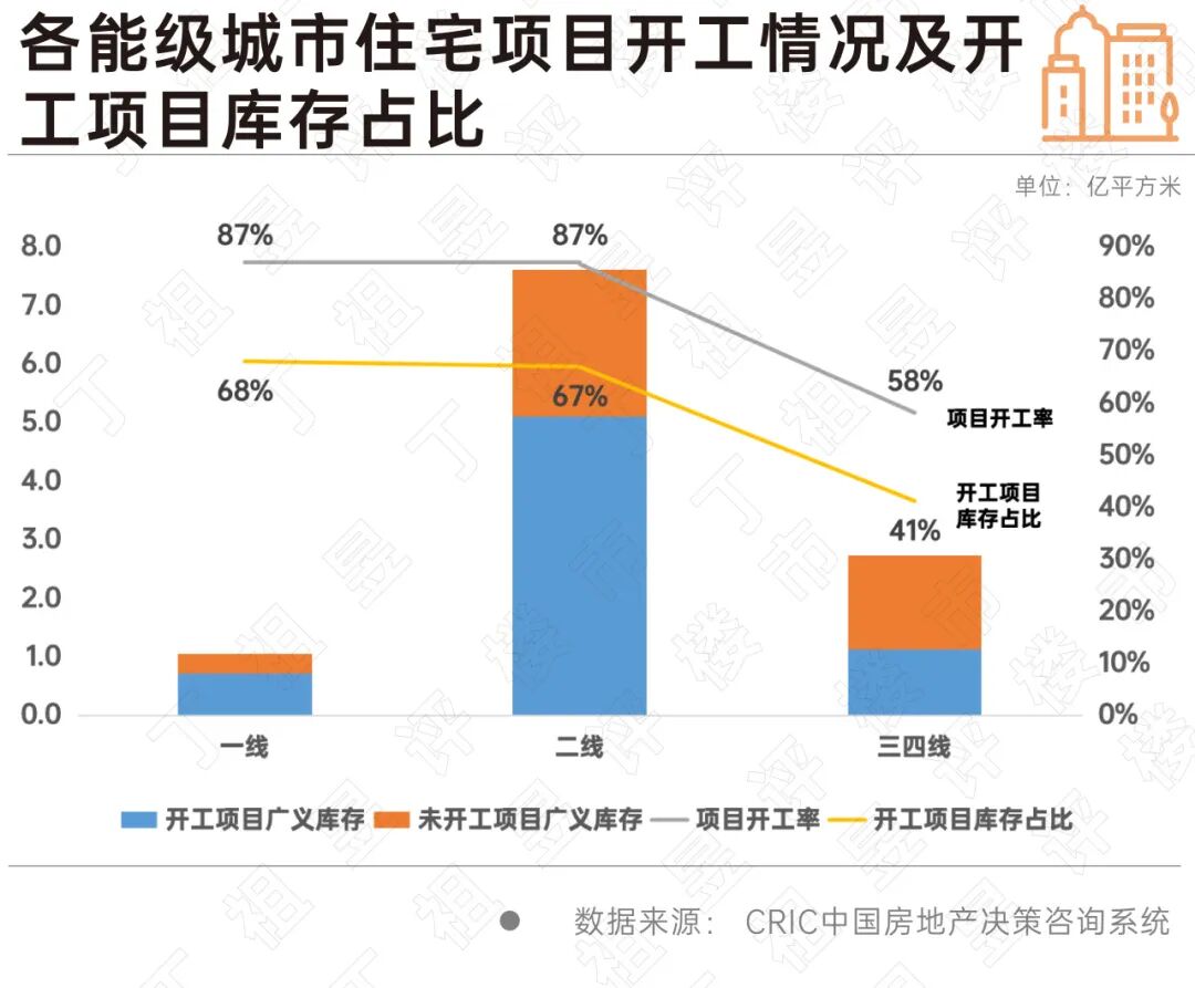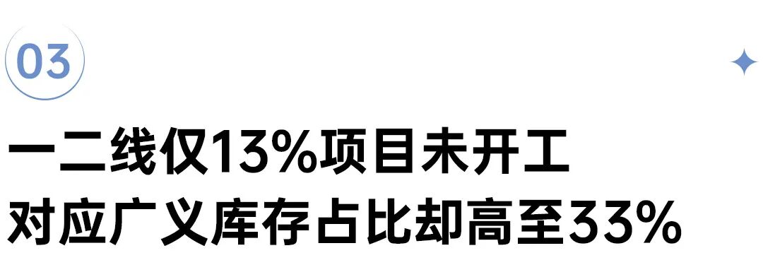 具体来看一二线城市,当前平均项目开工率达到87%,这意味着绝大多数项目已进入开发在建阶段,仅有13%的项目尚未启动开工流程。然而,结合广义库存指标深入分析便会发现,这仅占12%的未开工项目,却占据了33%的广义库存规模,大量高体量地块仍处于待开发状态,库存积压问题在未开工项目中表现较为突出。