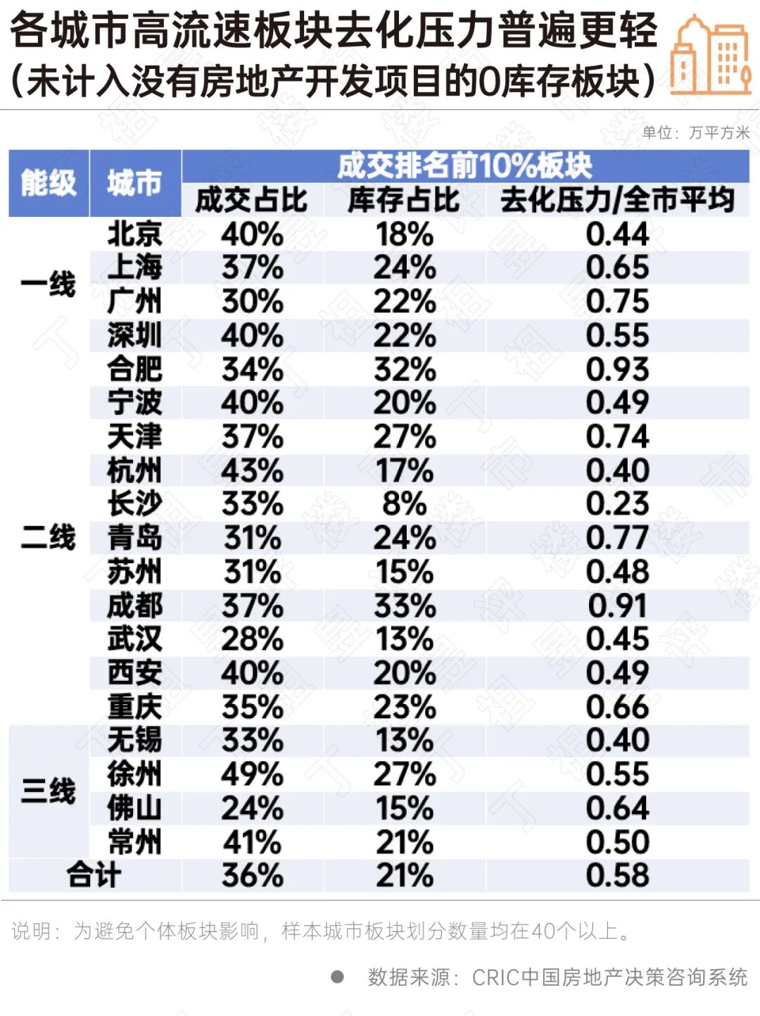 将各城市板块各自按年交易量排序,典型城市高流速板块(排名前10%)普遍库存压力更轻,是房地产市场止跌回稳的关键力量,因此在这一进程中更应小心呵护。