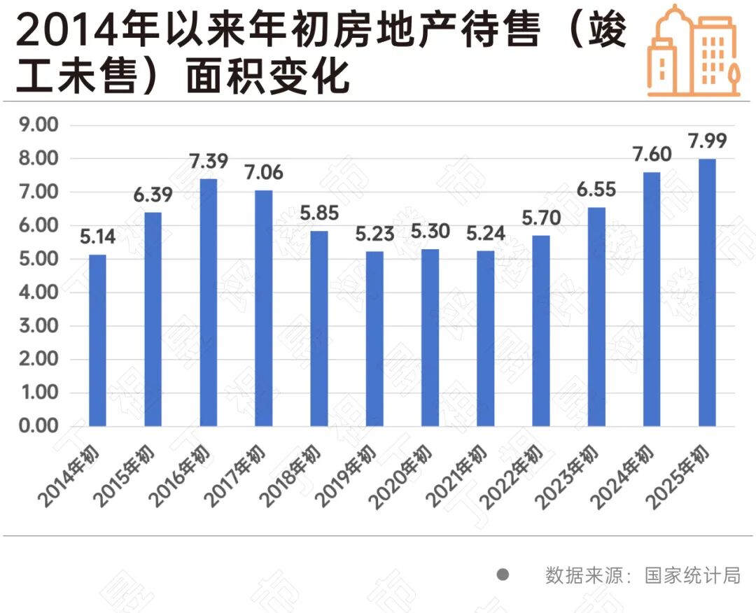 数据显示,2021年初该指标仅为5.24亿平方米,此后四年间始终保持上升态势,到2025年初已攀升至7.99亿平方米的历史新高,四年累计增幅超52%,待售房源积压问题日益突出,房企资金回笼压力持续加大。