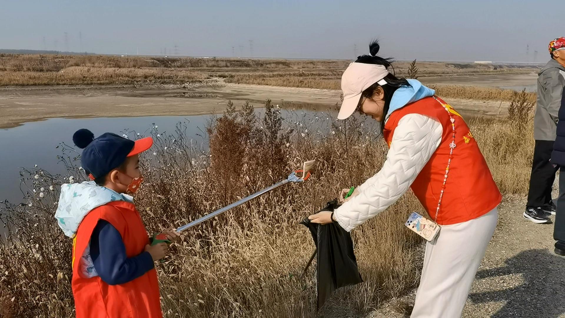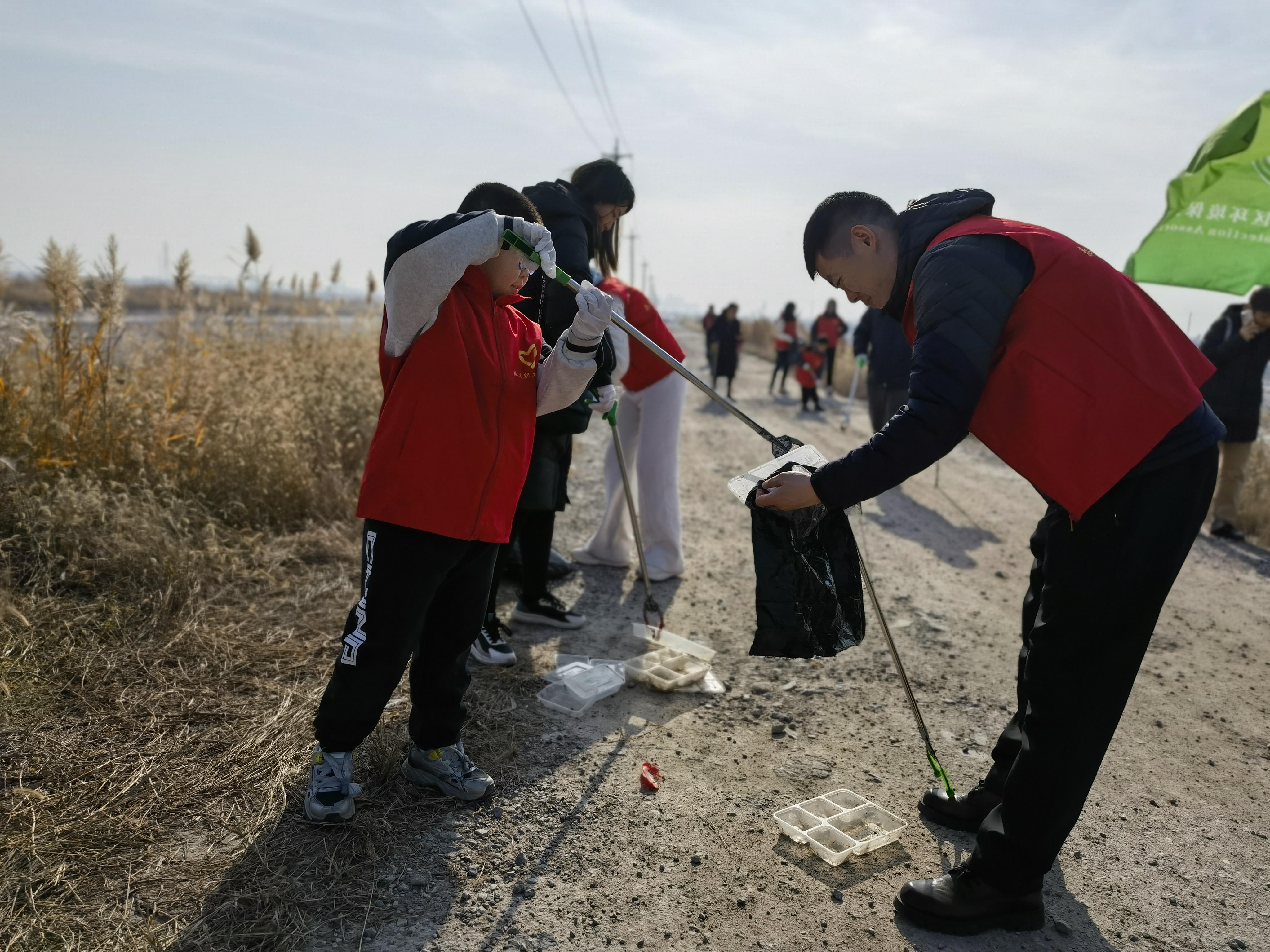 随后,志愿者们统一身着志愿马甲,手持工具夹和垃圾袋,在领队的带领下分组行动,沿湖岸及路边芦苇荡开展巡河与垃圾分类清理工作。大家分工协作,仔细捡拾散落在各处的塑料袋、饮料瓶盖等杂物,用实际行动还原河岸的洁净面貌。初冬的阳光温暖和煦,志愿者们忙碌的身影与静谧的湖岸相映成景,共同绘就了一幅人与自然和谐共生的动人画卷。家长李女士表示:“这次活动非常有意义,我们一家五口都参与了。不仅亲眼见到了新闻中报道的东方白鹳,还亲自为它们的栖息地做了环境护理,这个周末过得特别充实而有意义。”