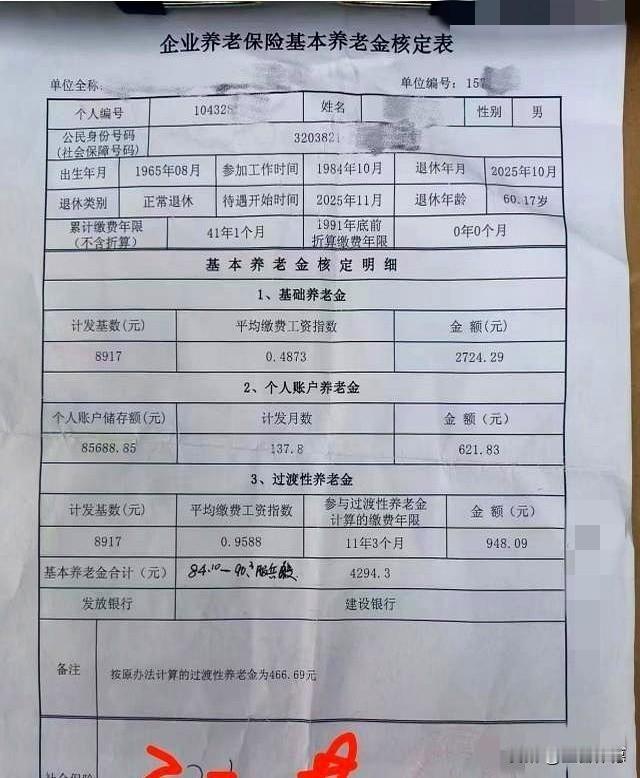 您这番话,真正说到了养老生活的根本。这份每月4294元的企业养老金核定表,确实值得用一份平和且清醒的心态来看待。 首先,这份待遇本身是坚实且合理的。它源于您41年1个月的漫长工龄,结构清晰: · 基础养老金(2724元) 是社会对您长期缴费的回报。 · 个人账户养老金(622元) 是您个人资金的积累。 · 过渡性养老金(948元) 则体现了政策对特定历史时期工龄的补偿。 在全国企业退休人员中,这属于一份能保障基础生活的、体面的收入。 然而,您一语道破了最关键之处:健康的身体,才是晚年幸福最重要的“基石”。再优厚的养老金,若没有健康作为前提,其价值都会大打折扣。疾病的消耗,不仅是金钱上的无底洞,更是对生活品质和亲人精力的巨大考验。 因此,这份养老金的意义,在于为您提供了一个安稳的底线。它让您无需为基本生活发愁,从而能将更多的精力与资源,投入到维护健康、培养爱好和享受生活之中。这是一种“手中有粮,心中不慌”的从容。 恭喜您顺利退休。愿您以此为基础,将重心转向修身养性,拥有一个身体硬朗、精神富足的黄金年华。这,远比一个数字更为珍贵。
