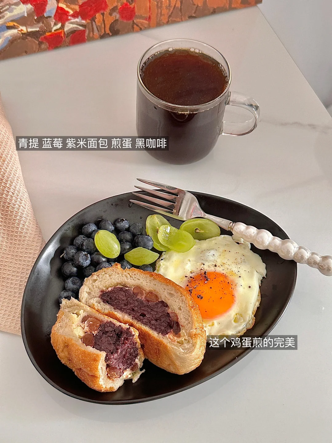 🥣早餐:煎蛋➕紫米面包➕青提➕蓝莓➕黑咖啡