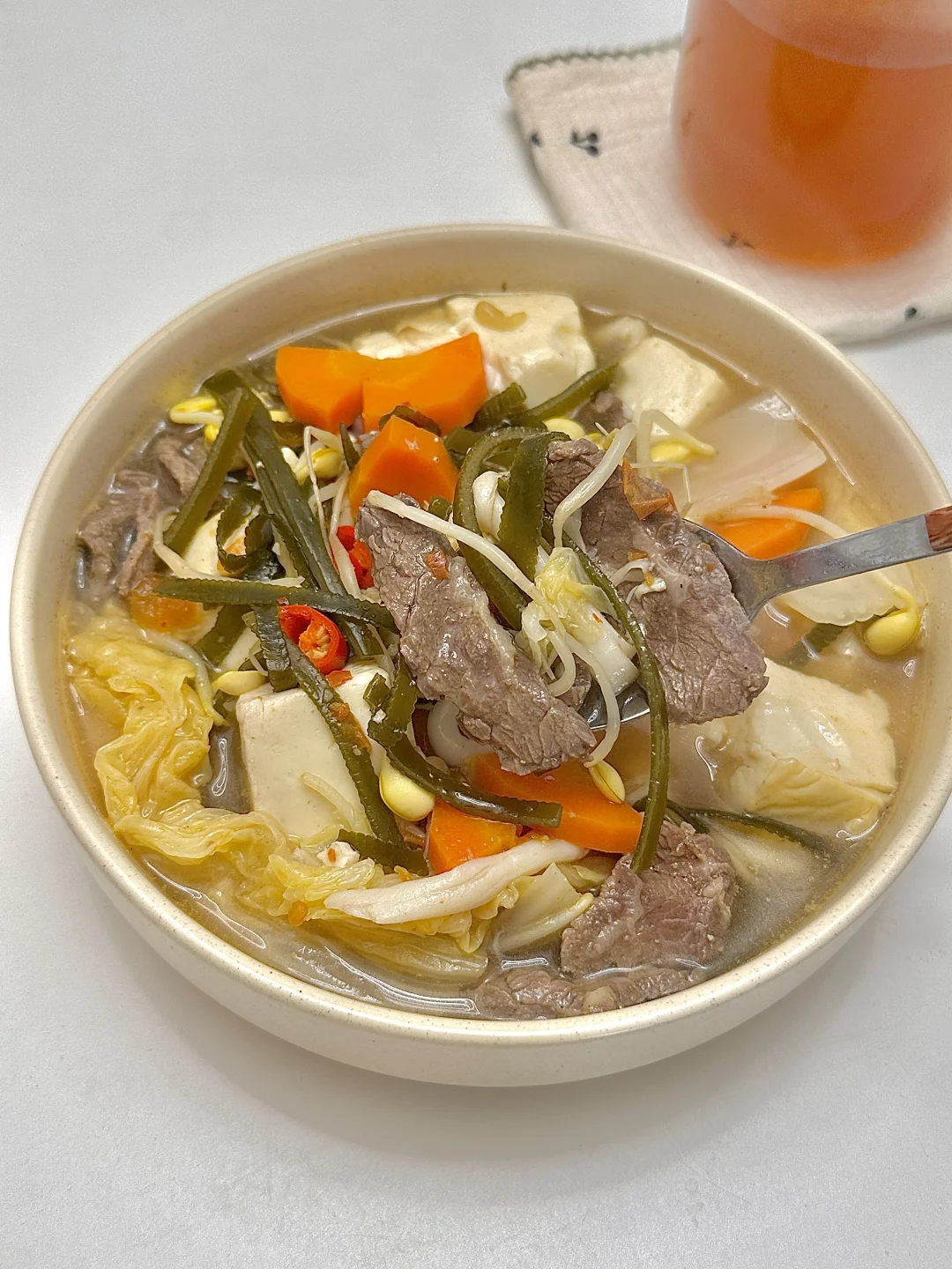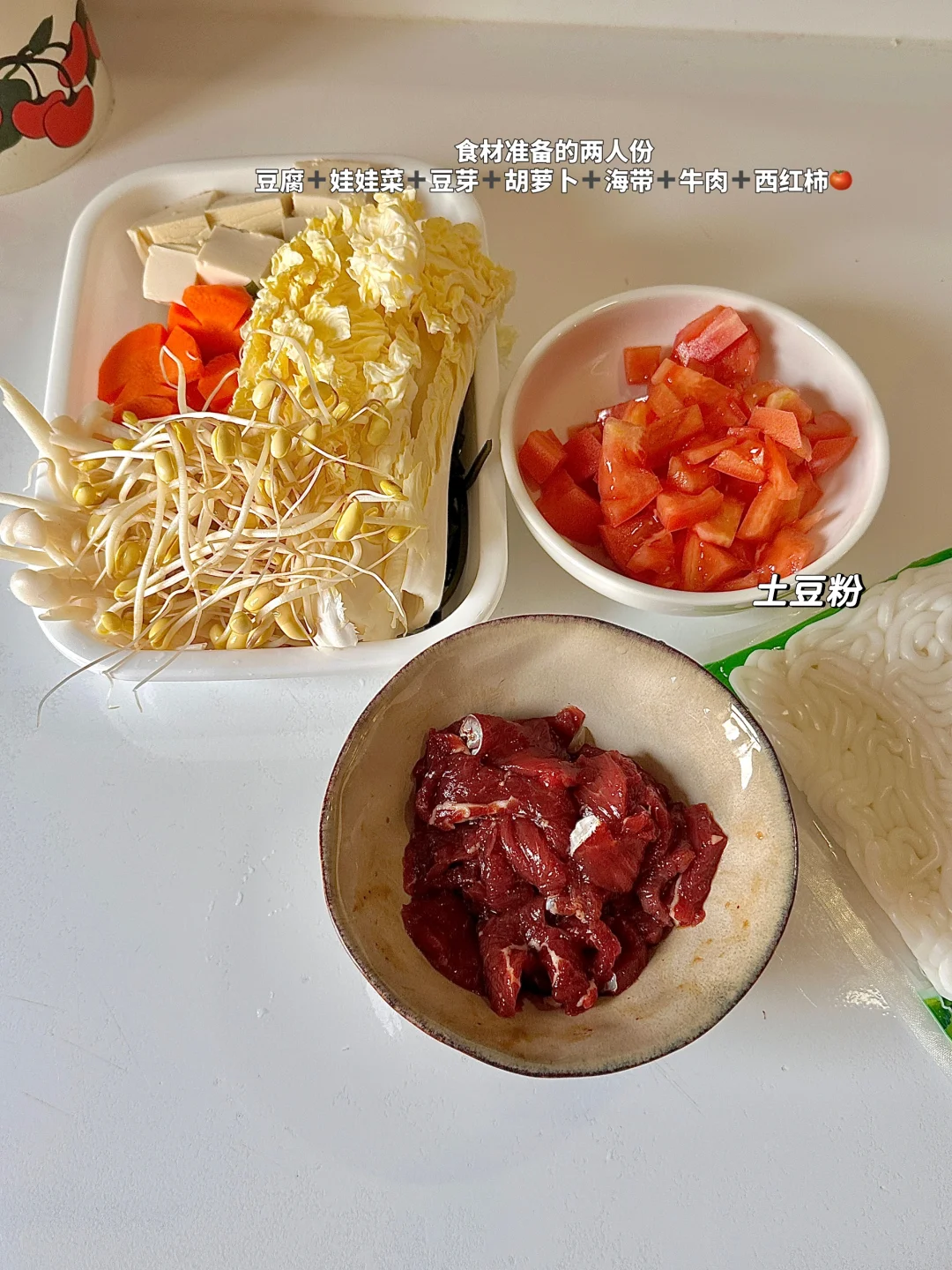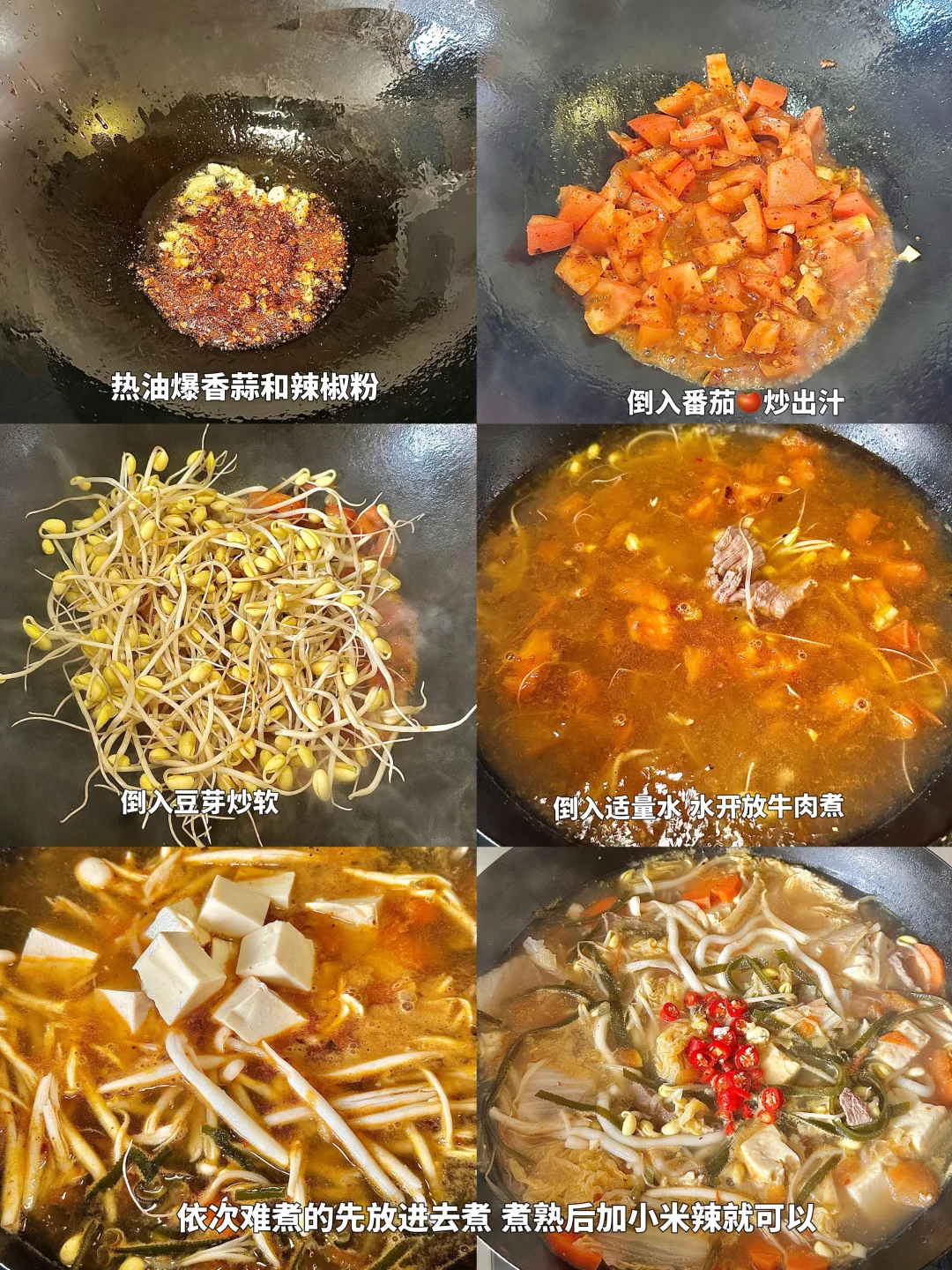一碗番茄🍅牛肉蔬菜汤 把喜欢吃的蔬菜加进去一锅出 酸辣开胃 低脂高蛋白 天冷减脂期喝一碗太幸福噜! 🥬食材:牛肉片➕土豆粉➕海带丝➕嫩豆腐➕娃娃菜➕豆芽➕白玉菇➕小米辣➕蒜末➕西红柿🍅➕胡萝卜🥕 👩🏻🍳步骤: 1️⃣牛肉用生抽 黑胡椒 料酒 耗油腌制15分钟 2️⃣蒜末 辣椒粉下锅炒香再加入豆芽 西红柿🍅炒出汁 3️⃣倒入适量清水 水开放牛肉 胡萝卜煮开 4️⃣把已熟的蔬菜 土豆粉放入锅中煮七八分钟 最后撒上小米辣出锅 减脂期姐妹做起来 巨好吃 喝一碗暖呼呼的! 好好吃饭 健康减肥