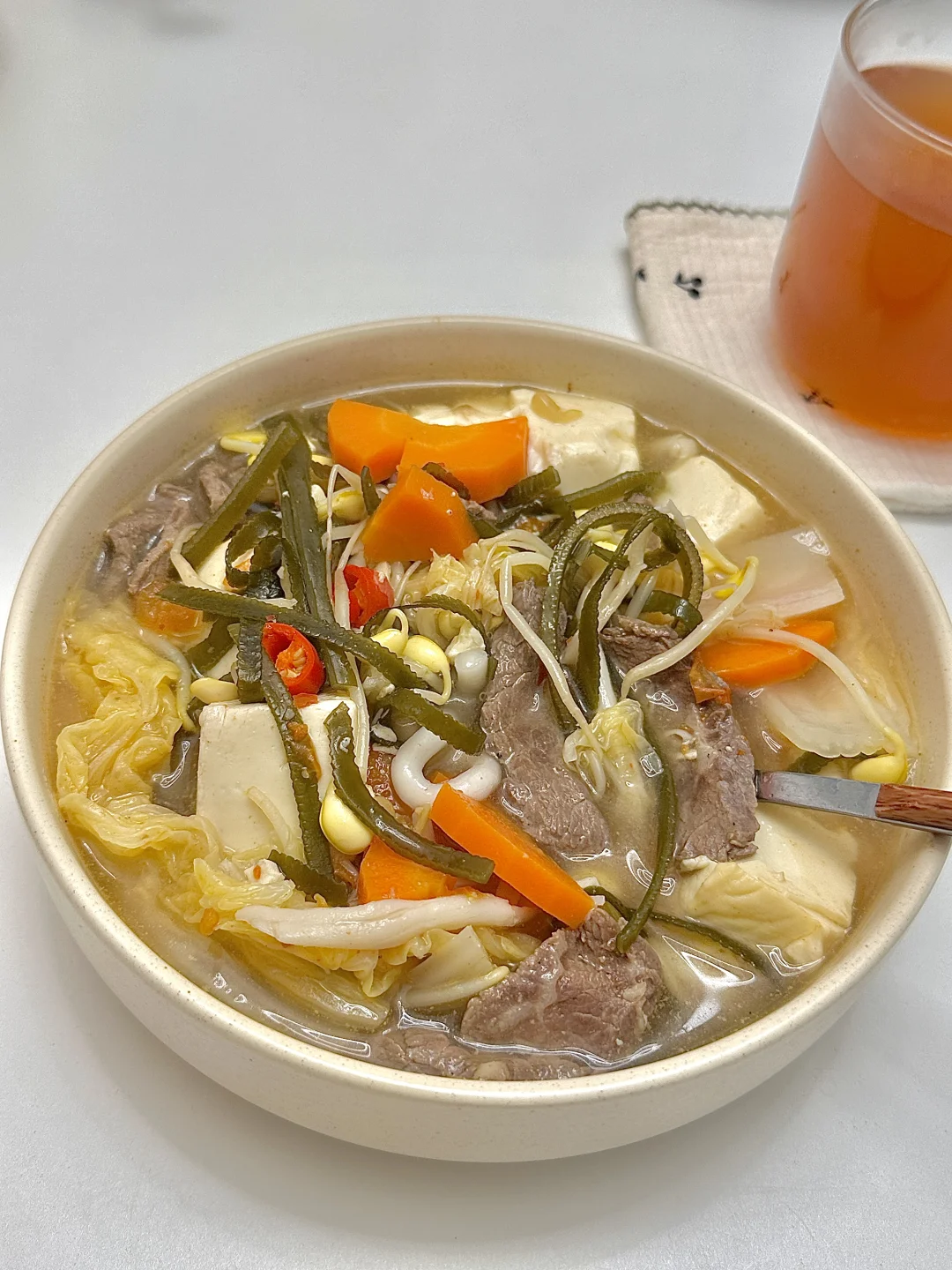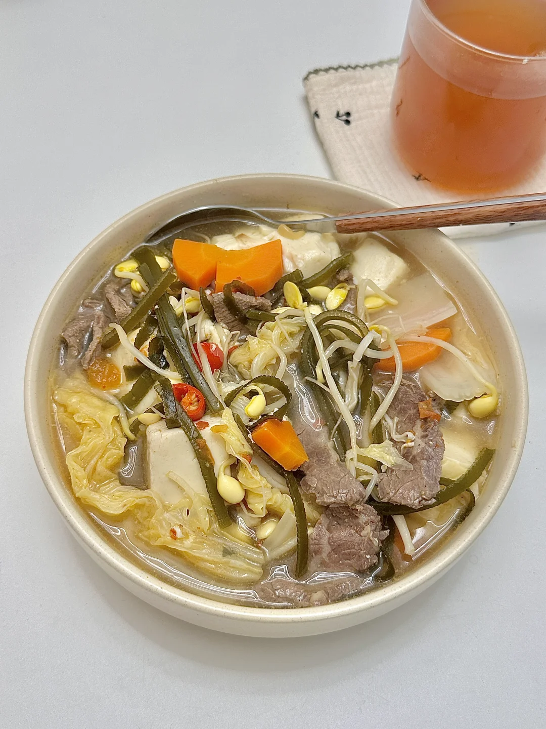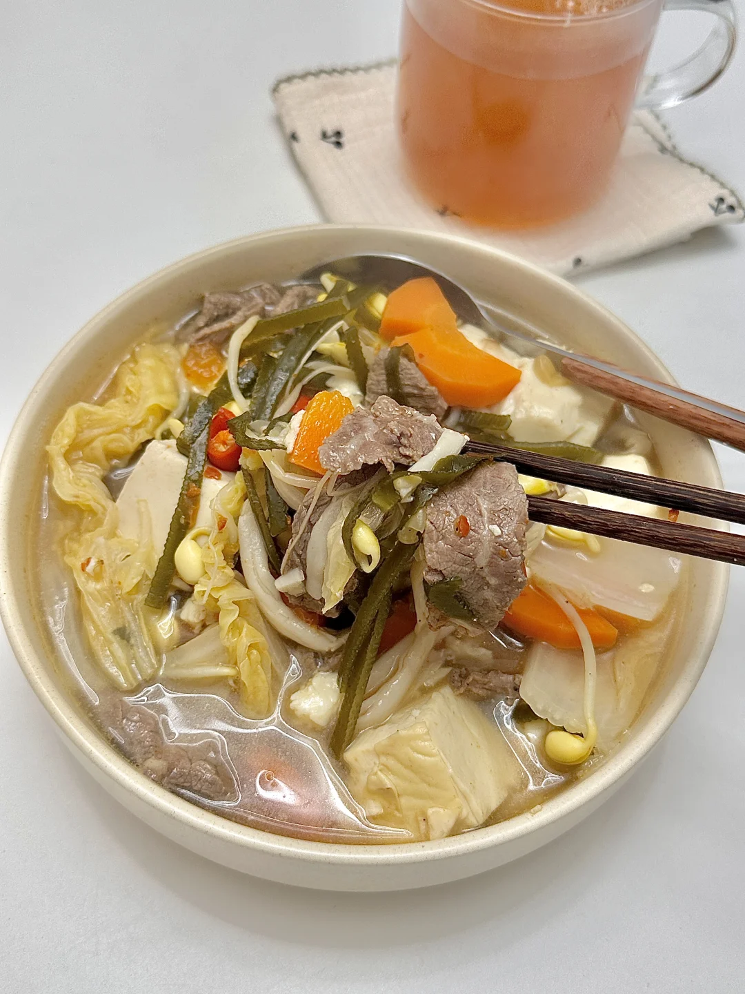 一碗番茄🍅牛肉蔬菜汤 把喜欢吃的蔬菜加进去一锅出 酸辣开胃 低脂高蛋白 天冷减脂期喝一碗太幸福噜! 🥬食材:牛肉片➕土豆粉➕海带丝➕嫩豆腐➕娃娃菜➕豆芽➕白玉菇➕小米辣➕蒜末➕西红柿🍅➕胡萝卜🥕 👩🏻🍳步骤: 1️⃣牛肉用生抽 黑胡椒 料酒 耗油腌制15分钟 2️⃣蒜末 辣椒粉下锅炒香再加入豆芽 西红柿🍅炒出汁 3️⃣倒入适量清水 水开放牛肉 胡萝卜煮开 4️⃣把已熟的蔬菜 土豆粉放入锅中煮七八分钟 最后撒上小米辣出锅 减脂期姐妹做起来 巨好吃 喝一碗暖呼呼的! 好好吃饭 健康减肥