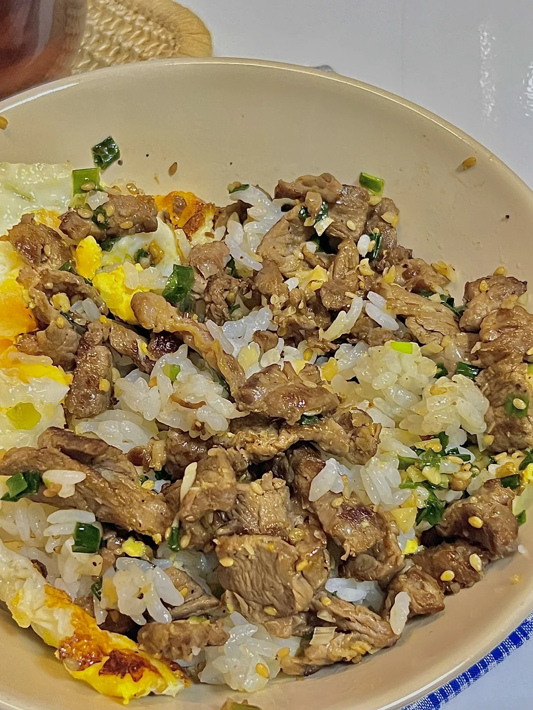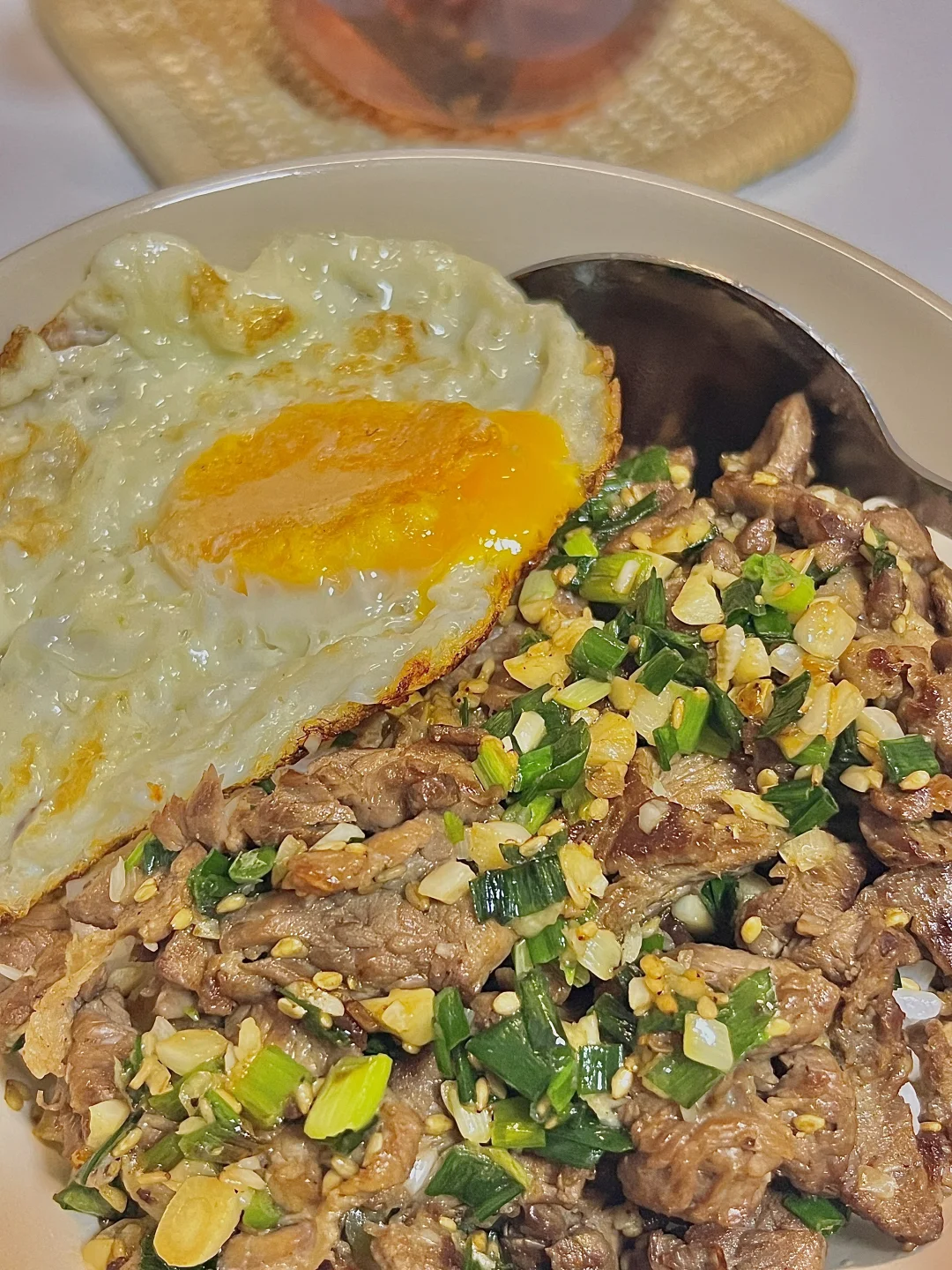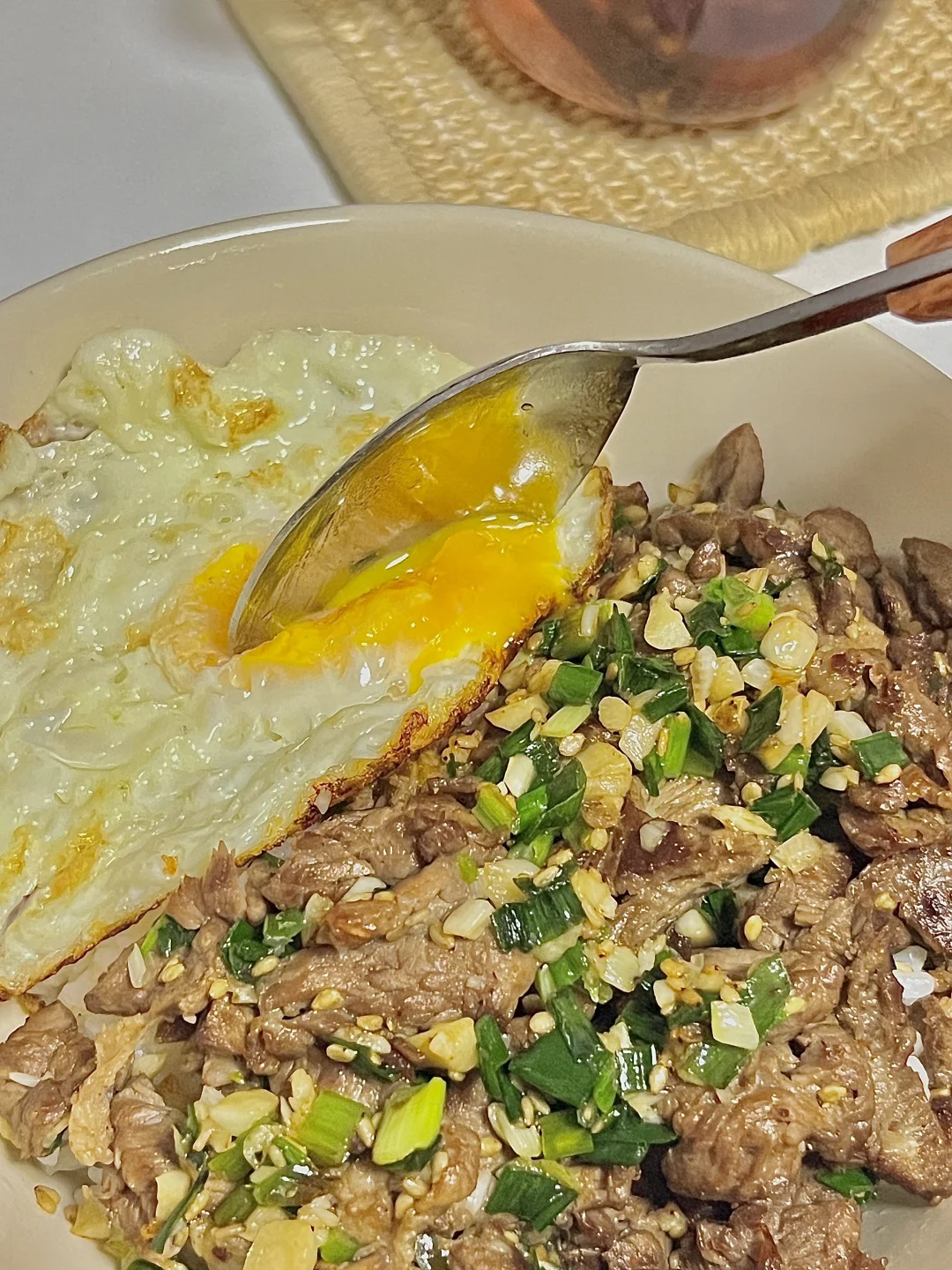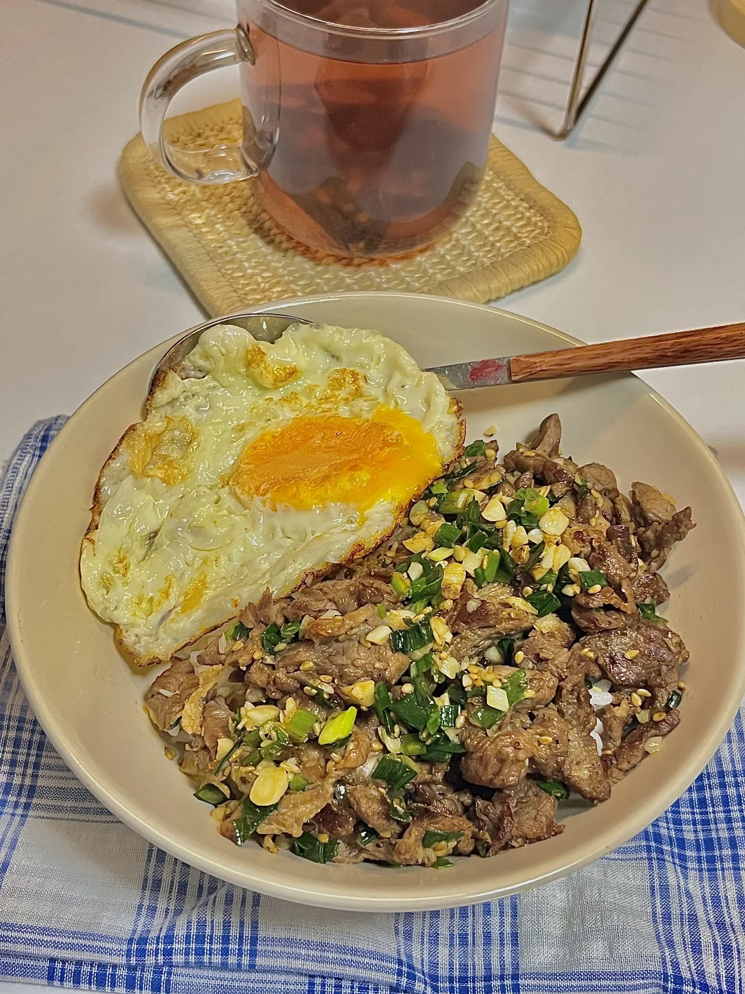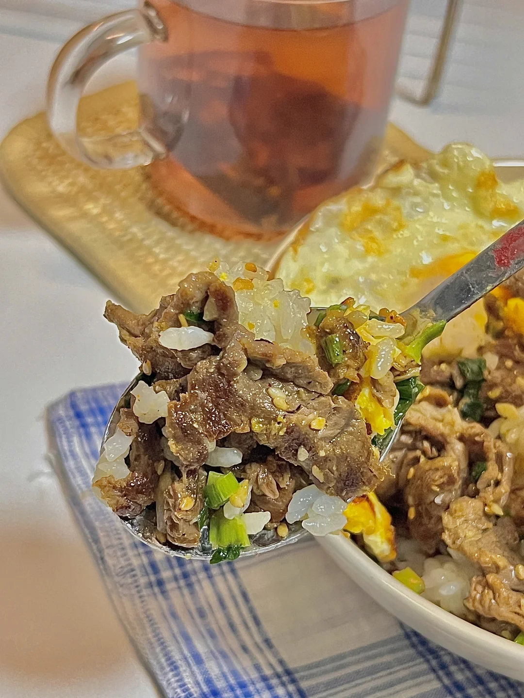做菜我是认真的 今日份一人食: 盐葱牛肉饭 玉米须茶🍵 ~ 🥩低卡盐葱牛肉拌饭,谁懂呀~特别特别香,牛肉嫩,酱汁香,煎个鸡蛋拌饭入味巨香,减脂又美味做法还简单! 做法在图上⬆️