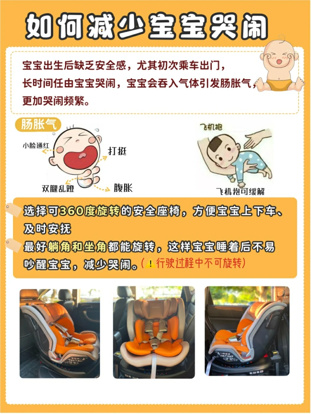 ▫️当宝宝出现不适或感到没有安全感,会通过哭闹来表达,尤其是在安全座椅上睡着后,很多座椅必须要调节到固定角度才能旋转,容易吵醒宝宝引发哭闹,长时间哭闹会因为吞入空气导致肠胀气,宝宝会因体感不适反复哭闹,出现恶性循环。