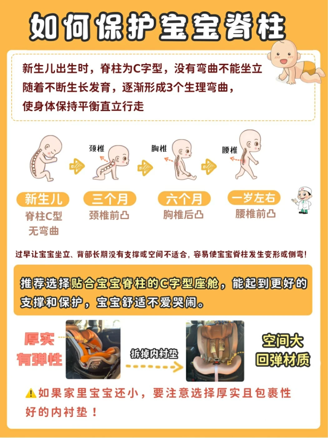 🔸宝宝出生后脊柱呈C型,没有任何弯曲,所以还不能久坐和站立,而且背部要有一定的支撑力,否则脊柱容易出现侧弯甚至变形。