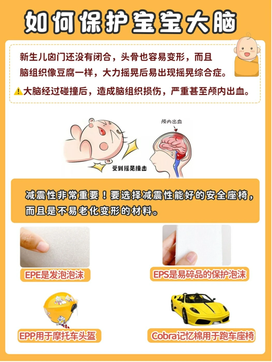 🔸宝宝出生后卤门没有闭合,头骨也容易变形,而且大脑像豆腐一样,还没发育好,不可以大力摇晃,因为在摇晃或撞击的时候,大脑和颅骨经过碰撞,造成脑组织损伤,严重甚至会颅内出血,所以安全座椅的减震性能很重要,