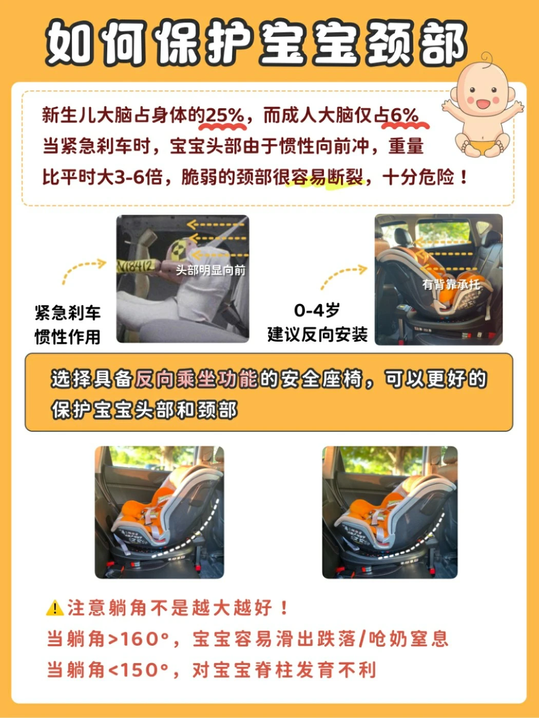 🔹当遇到紧急刹车时,宝宝的头部由于惯性作用向前冲,娇嫩的脊椎容易出现断裂!