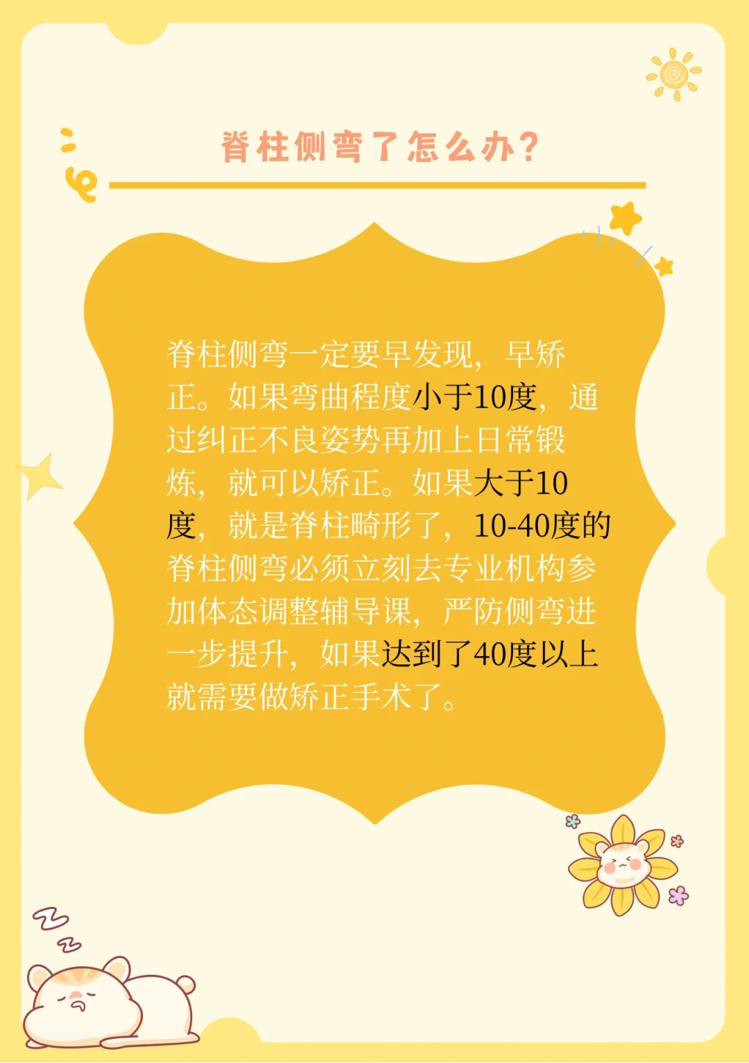 脊柱侧弯一定要早发现,早矫正。如果弯曲程度小于10度,通过纠正不良姿势再加上日常锻炼,就可以矫正。如果大于10度,就是脊柱畸形了,10-40度的脊柱侧弯必须立刻去专业机构参加体态调整辅导课,严防侧弯进一步提升,如果达到了40度以上就需要做矫正手shu了。