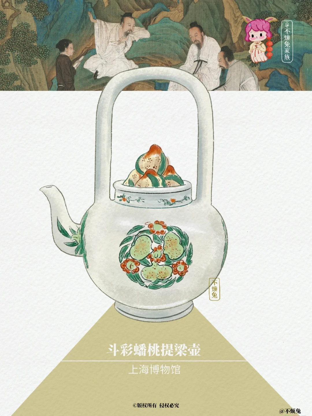 此壶将捏塑与彩绘融为一体,纹饰布局合理,四面均用淡描青花内填染彩的技法,描绘四组团桃图案,每组枝叶穿插盘绕,桃花盛开,果实累累。