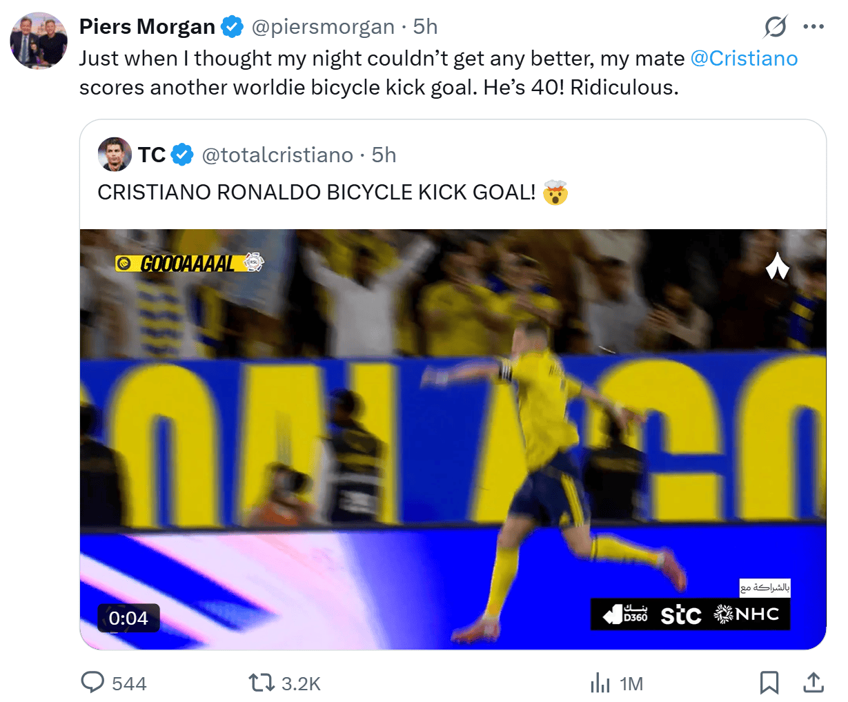 赛后,著名主持人皮尔斯-摩根更新了社交媒体,夸赞了C罗的表现。他在社媒上写道:“就在我以为这个夜晚已无惊喜的时候,我的兄弟C罗又打进了一记世界级的倒挂金钩进球。他都40岁了啊!太不可思议了。“