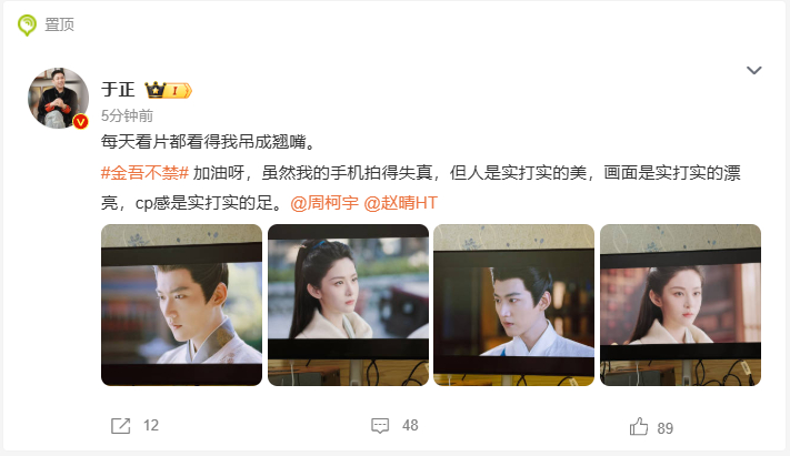 于正表示《金吾不禁》片花吊足期待,让人吊成翘嘴,且赵晴周柯宇 cp 感十足,直白