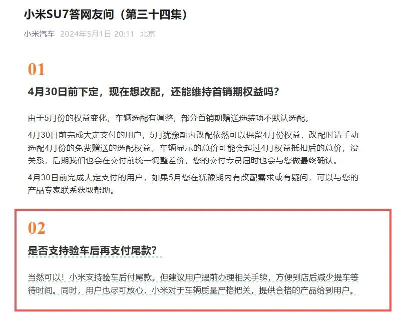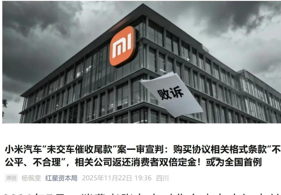 小米汽车输了官司,赔了10000块,这起案件很有代表性。全国第一起小米汽车未交车催收尾款案,近日在海南海口宣判,小米汽车被判败诉,相关条款不公平不合理,尤其是小米汽车明确支持验车后付尾款,结果判小米双倍返还购车人定金共10000元。 事发24年7月,海口李女士下单预定了一辆小米SU7 max,交了5000块定金。3个月后的10月,小米突然告知李女士她定的车一周后到店,具体提车时间将会提前。按当时小米汽车的火爆程度,排产时间都排队到近一年以后,对于这次提前交车,李女士表示当时资金不足希望顺延提车,并同小米确认重新排产。 没想到变故发生在一个半月后的12月初,小米汽车突然单方面通知李女士,要求7天内交齐31.39万的尾款,否则按违约处理,订单取消定金不退。 李女士怒了,车子还没排产,影子都还没见着呢,就要客户把尾款全交了,还不带任何协商,就单方面通知,妥妥的霸王条款。李女士不接受,向小米汽车提出退定金不买了,然而经12345和市监的人当场沟通,小米都强硬的不足让步,坚持扣除李女士全部定金,无奈之下李女士诉诸法律,并最终获得法院支持。 该案可谓给了小米汽车一记重击,车子卖的再火爆,也不能店大欺客。这起事件也让雷军一直以来树立的平民老板的形象遭到动摇。这起案件不是个例,对小米汽车敲响了警钟,接地气不仅仅是老板弯腰帮车主开个车门就够了,而是事关用户的权益都应该切实落到实处。小米汽车的造车路才刚开始,雷军可大意不得。