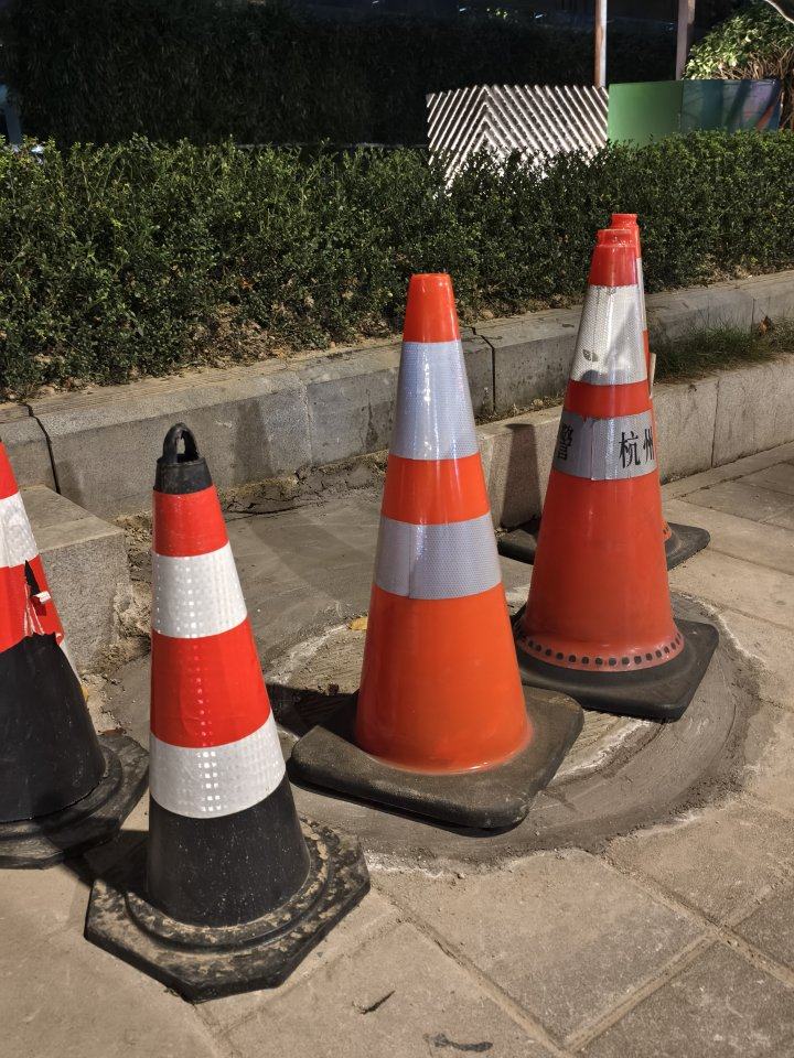 记者了解到,涉事窨井盖凸起部分已经被铲平,窨井盖高度和人行道路面一致,由于施工后水泥未干,窨井盖周围放了五个交通锥作为警示。