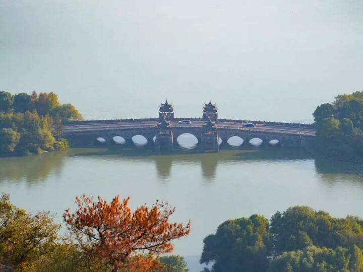 此亭虽不宏丽,位置却极佳——空气能见度高时,远望可见钱塘江、富春江、浦阳江三水交汇,烟波浩渺,水天一色。
