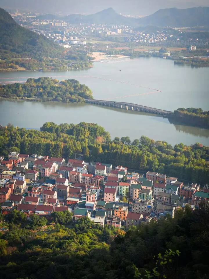 村落之外,再远处,湘湖如一块碧玉静卧于山峦之间,湖光潋滟,岛屿点缀,舟楫隐约,好一幅江南水墨画卷。
