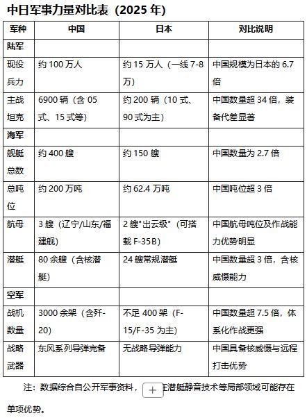 图一:为日本网友发的中日军事力量对比,最后一项比较好玩,谁说日本人没有幽默感? 图二:为借助DC给出的数据。 (注:具体数据只供参考) 我们不要小看日本的军事力量。日本虽然有《和平宪法》的限制,但是这些年来,也在悄悄发展自己的军事力量。美国也是睁一只眼闭一只眼。 日本军事力量在2025年全球排名中位列第八位。这是由“全球火力”(Global Firepower)网站给出的排名,该机构通过量化分析50余项指标(如现役兵力、装备数量、国防开支、工业能力和地理条件)对超130个国家进行综合评估。