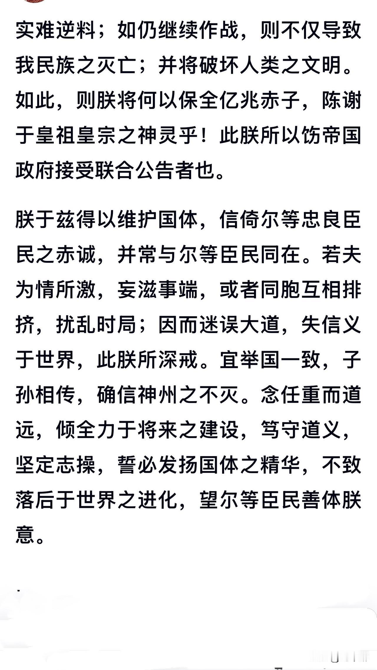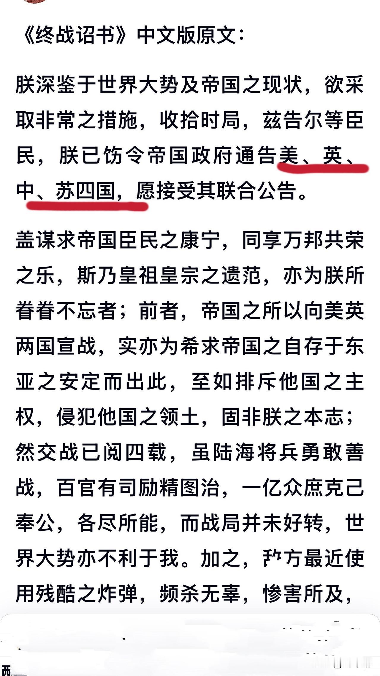 日本《终战诏书》,通篇未提“投降”或“战败”,仅称“终止战争”,将投降归因于“敌方使用残酷之炸弹”和“保护国民”,而非承认战败 。 一是美化侵略动机 诏书将战争动机美化为“希求帝国之自存于东亚之安定”,并称“东亚解放”,试图为侵略行为辩解 。 二是蔑视中国战场 仅提及对美英的4年战争,完全忽略1931年起的侵华战争,对中国受害事实只字未提 。 三是保留天皇国体 诏书强调“维护国体”,为右翼势力保留军国主义复辟的伏笔,未对战争进行实质反思 。 80年来,诏书的模糊措辞影响了日本社会对战争责任的反思,导致部分右翼势力至今仍试图淡化侵略罪行 、妄图军国主义死灰复燃!