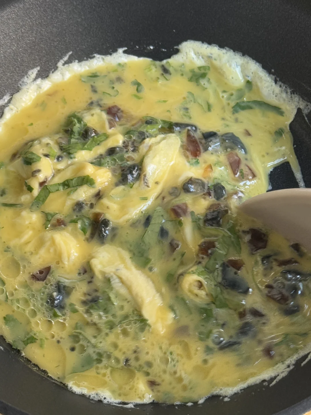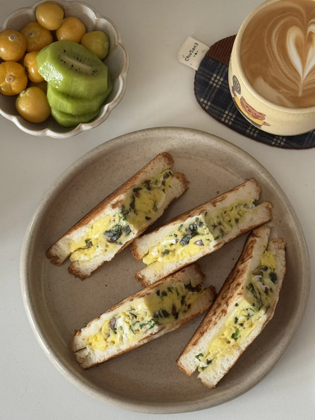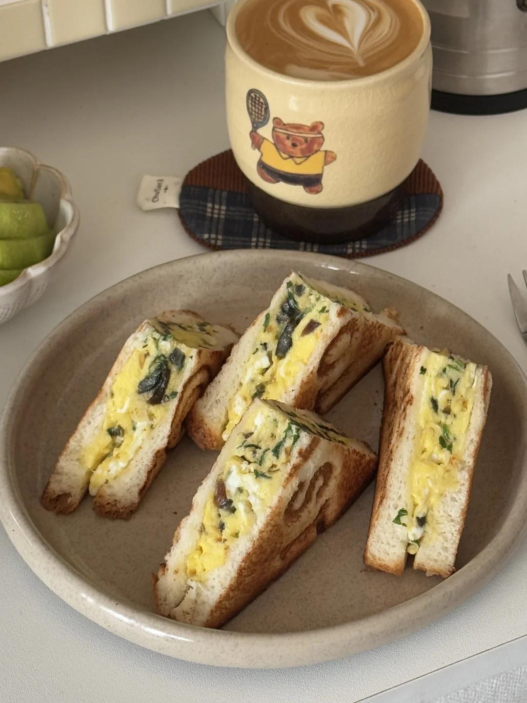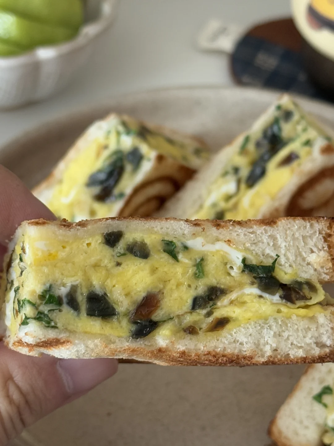 去茶餐厅吃了这个三明治🥪 有点好吃😋回家就自己复刻了! - 半个皮蛋 两个鸡蛋 一把香菜 加点盐和牛奶搅打均匀 之后夹到吐司里热压一下就完成了✅ - 感觉下次可以再多加一点香菜[暗中观察R]