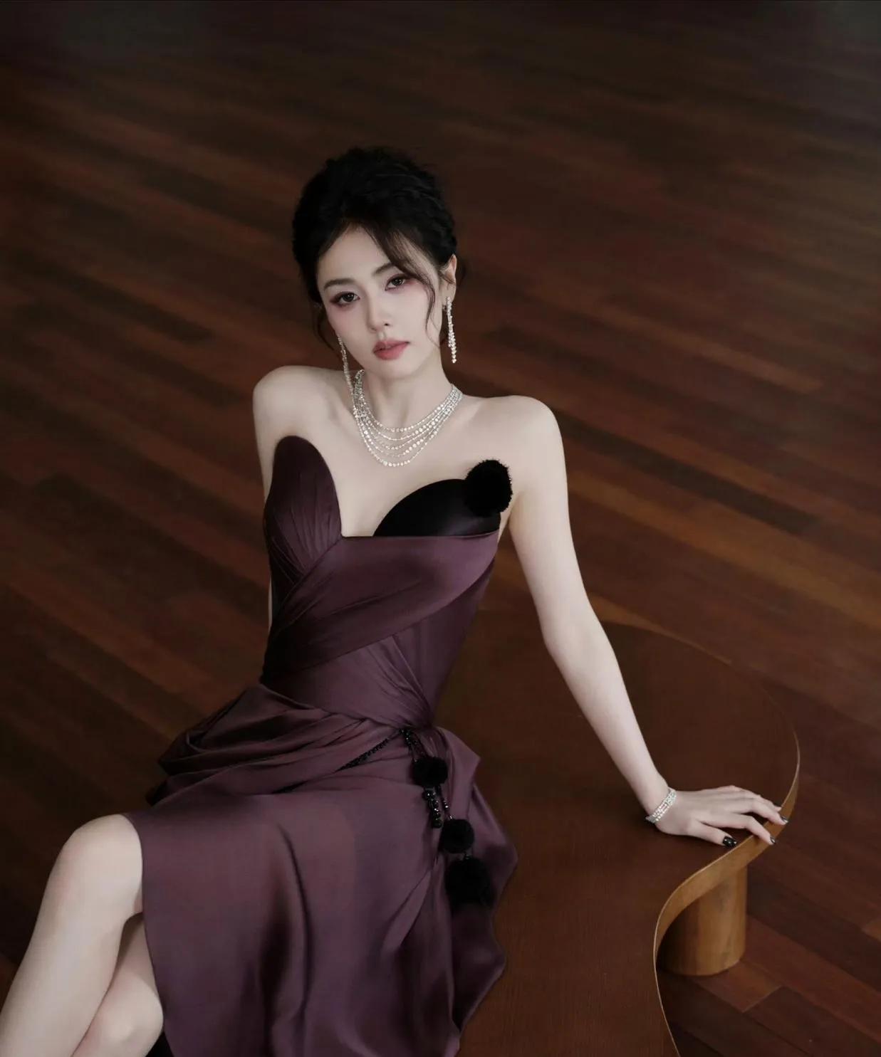 白鹿抹胸长裙造型 优雅又性感 白鹿这身深紫色抹胸长裙太绝了!缎面材质高级感拉