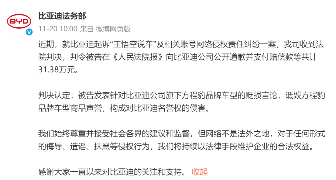 判了!比亚迪胜诉,黑公关赔偿比亚迪损失费!车圈的黑公关层出不穷,不单让企业背上黑锅,更是搅得互联网乌烟瘴气,让企业和消费者无比厌烦。有这么一个叫做“王悟空说车”自媒体,用扳手去扳方程豹车架,随后瞎带节奏说一次就能这车一掰就弯,安全性能很差。视频一出,直接给方程豹套上了低质量的说法,当然比亚迪肯定是不能忍受这种造谣行为立刻取证走了司法程序,最终也查明了结果:是故意造假诋毁。11月20日比亚迪法务部发布公告,公告显示:法院经审理认定,自媒体账号 “王悟空说车”发表针对比亚迪旗下方程豹品牌车型的贬损言论,已构成对企业名誉权的侵害,最终判决被告需向比亚迪公开赔礼道歉,并支付共计 31.38 万元赔偿款。公关部李云飞也转发表示:能够接受理解误解信息,但是为了黑而黑的黑公关绝不容忍,技术竞争才是良性之争! 目前抖音账号“王悟空说车”、“987疯狂奶爸”因多次歪曲事实诋毁新能源汽车性能、恶意抹黑汽车企业形象声誉,被依法依约关闭。中央网信办在《汽车行业网络乱象专项整治行动公开曝光一批典型案例》中也明确指出了这一点。某些企业有时候真的挺让人恶心的,哪家企业做的好成为第一就会成为围攻的对象,当年特斯拉第一,他们一起攻击特斯拉,而比亚迪成为第一新能源车企后,他们又开始攻击比亚迪。当然就像这次一样,那些曾经带节奏黑比亚迪的都受到了应有的惩罚,比如“龙猪-集车”赔偿比亚迪201.87万账号全网封禁。黑公关猖獗,除了背后金主的支持,更是因为大众就喜欢看这些东西,被舆论带着节奏走,我非常支持车企拿起法律的武器攻击这些黑媒体,也更希望观众们都能有自己独立思考的能力,不要成为别人的枪而不自知。