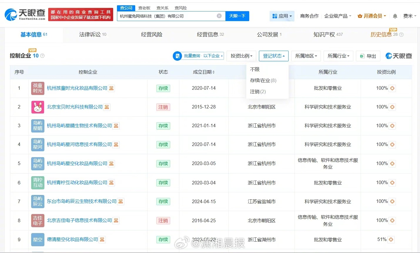 据媒体报道,近期,广州市市场监督管理局发布的化妆品专项抽检结果显示,在2066批次受检样品中有40批次不符合规定,一款倍膳健儿童润肤乳超标820倍,头部品牌兔头妈妈旗下的一款儿童蚕丝润护洗发水也被检出菌落总数超标48倍。据了解,这两款问题产品均标注了儿童化妆品专属标志“小金盾”。 查询天眼查发现,兔头妈妈关联公司杭州蜜兔网络科技(集团)有限公司成立于2020年3月,法定代表人为韩丹,注册资本1000万美元,经营范围包括计算机软硬件及辅助设备零售、针纺织品销售、日用品零售等。股东信息显示,该公司由蜜缇国际有限公司全资持股。控制企业信息显示,该公司控制10家企业,其中8家企业处于存续状态,包括杭州孩童时光化妆品有限公司、杭州岛屿星晴生物技术有限公司、杭州岛屿星河信息技术有限公司等。