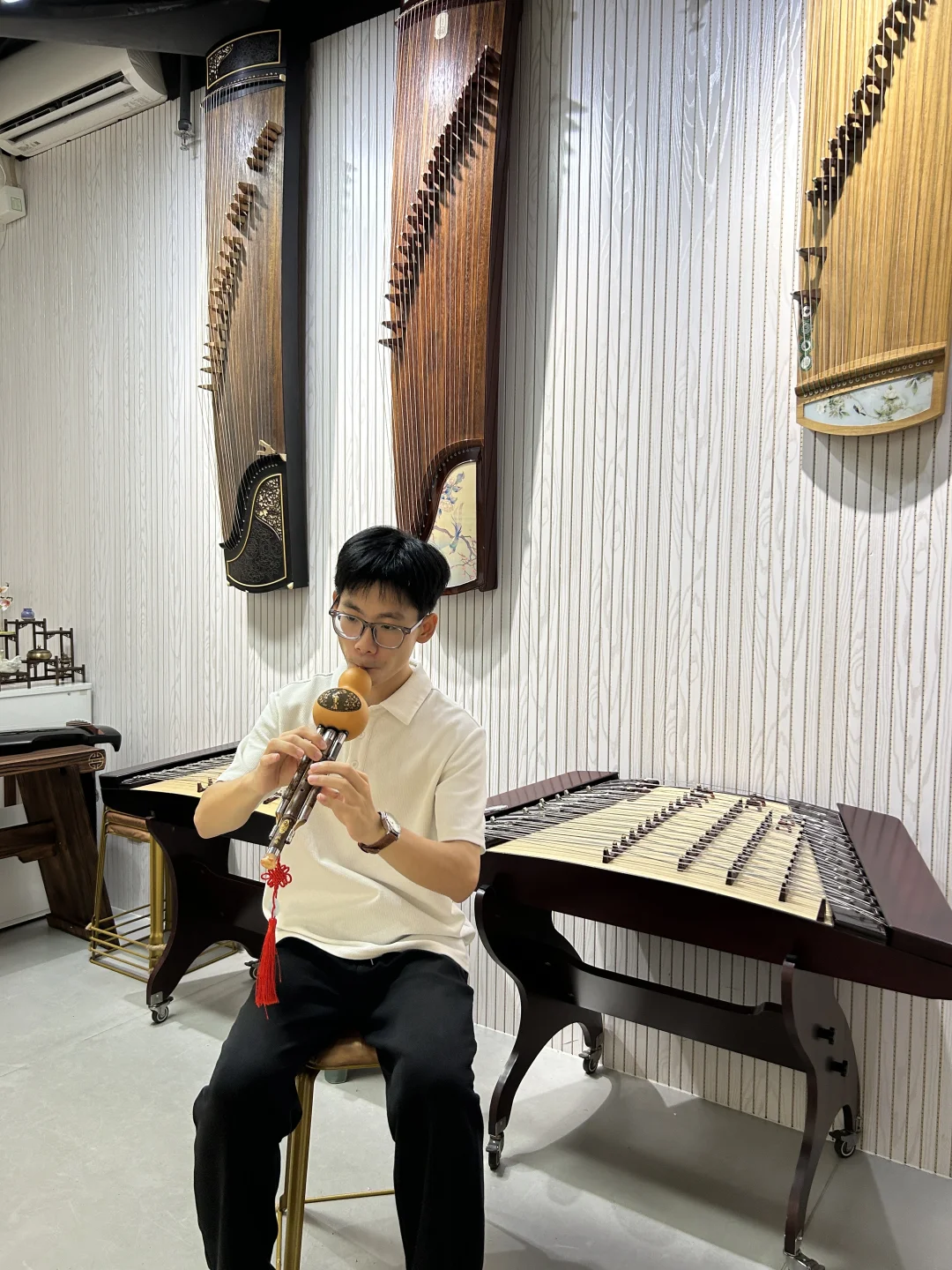 提前打电话约了葫芦丝体验,刚坐下就见一位穿素色棉麻衫的男老师走进来,手里拎着个青绿色的葫芦丝,气质绝了!没等我开口,他直接坐定、抬手,一段《荷塘月色》就飘了出来——那声音软乎乎的,像晚风拂过荷叶,又带点清冽的水汽,我听得眼睛都直了,鸡皮疙瘩蹭蹭冒!原来咱中国古典乐器能这么仙,之前总吹萨克斯的我,第一次觉得“温柔”还能被乐器吹出来~