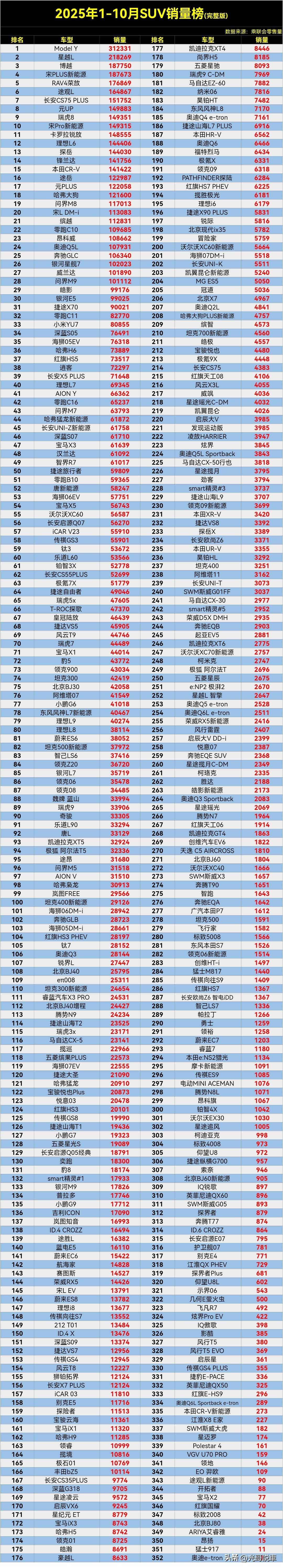 看完再买,看完再买。2025年1-10月SUV零售销量排行榜完整版已经揭晓,看了真让人惊讶,排名已大洗牌,纯电车ModelY强势夺冠,取得31.2万辆的佳绩,燃油车吉利星越L、博越都杀进了前三名,销量分别为21.8及18.7万辆,RAV4荣放17.6万辆,长安CS75P、瑞虎8、卡罗拉锐放、本田CR-V表现也很不错,均入榜前15名,销量都在14万辆以上。