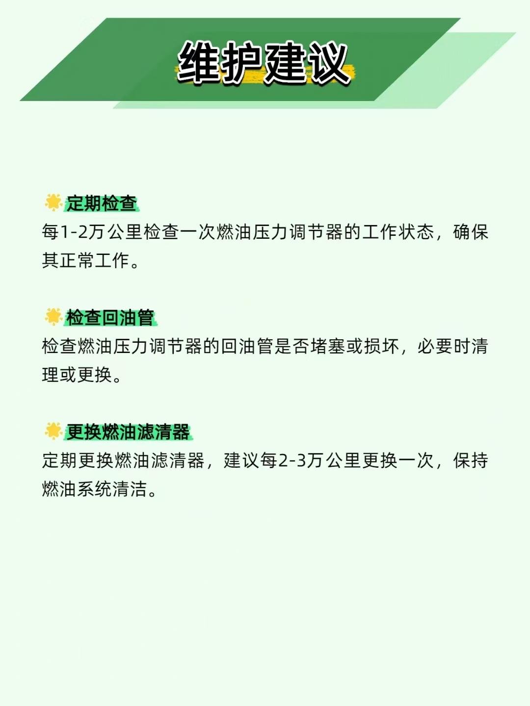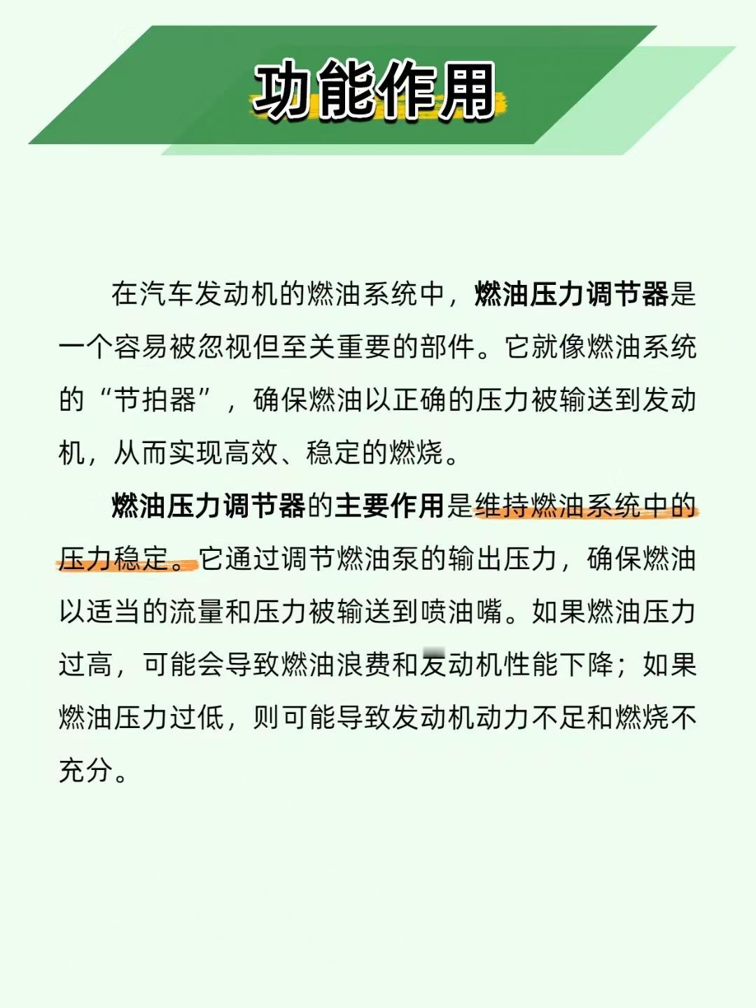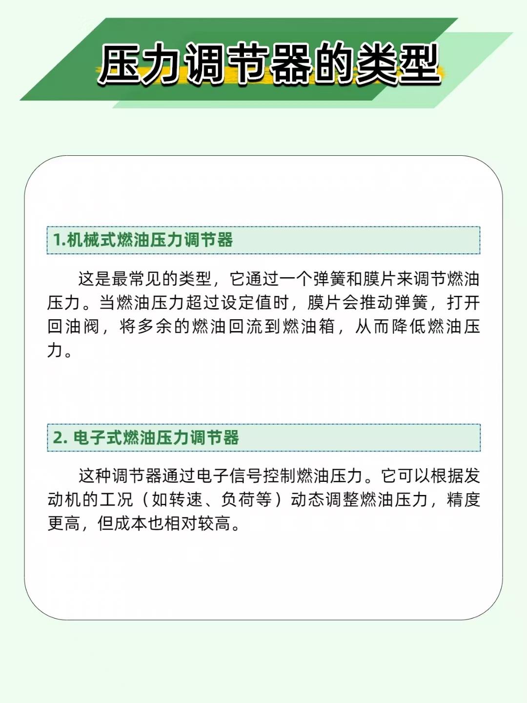 【油耗飙升、动力疲软?燃油压力调节器才是 “幕后管家”!】 汽车燃油系统里,燃油压力调节器就像个 “压力管家”—— 把燃油压力控制得稳稳的,发动机才能高效燃烧! ——————————————————————————————————————————— 🔧 两种类型,各有千秋 机械式:弹簧 + 膜片调节,成本低、耐用,家用车标配; 电子式:电子信号精准控压,适配高性能车,就是维修成本高。 ——————————————————————————————————————————— ⚙️ 工作原理很简单 机械式靠 “弹簧 + 膜片”:压力高了,膜片推开回油阀,多余燃油流回油箱;压力低了,膜片收缩关阀升压。公式总结:调节后压力 = 输入压力 - 弹簧预设压力,一目了然~ ——————————————————————————————————————————— ⚠️ 3 种故障要警惕 压力过高→油耗暴涨、动力下降→查回油管是否堵塞、弹簧是否损坏; 压力过低→动力疲软、燃烧不充分→查燃油泵、膜片是否损坏; 压力不稳→发动机抖动、加速无力→用压力表检测,检查安装是否松动。 ——————————————————————————————————————————— 📌 维护牢记 3 点 每 1-2 万公里检查调节器状态; 定期清理 / 更换回油管; 每 2-3 万公里换燃油滤清器,保持燃油清洁。 你的车有过动力弱、油耗高的情况吗?评论区聊聊~