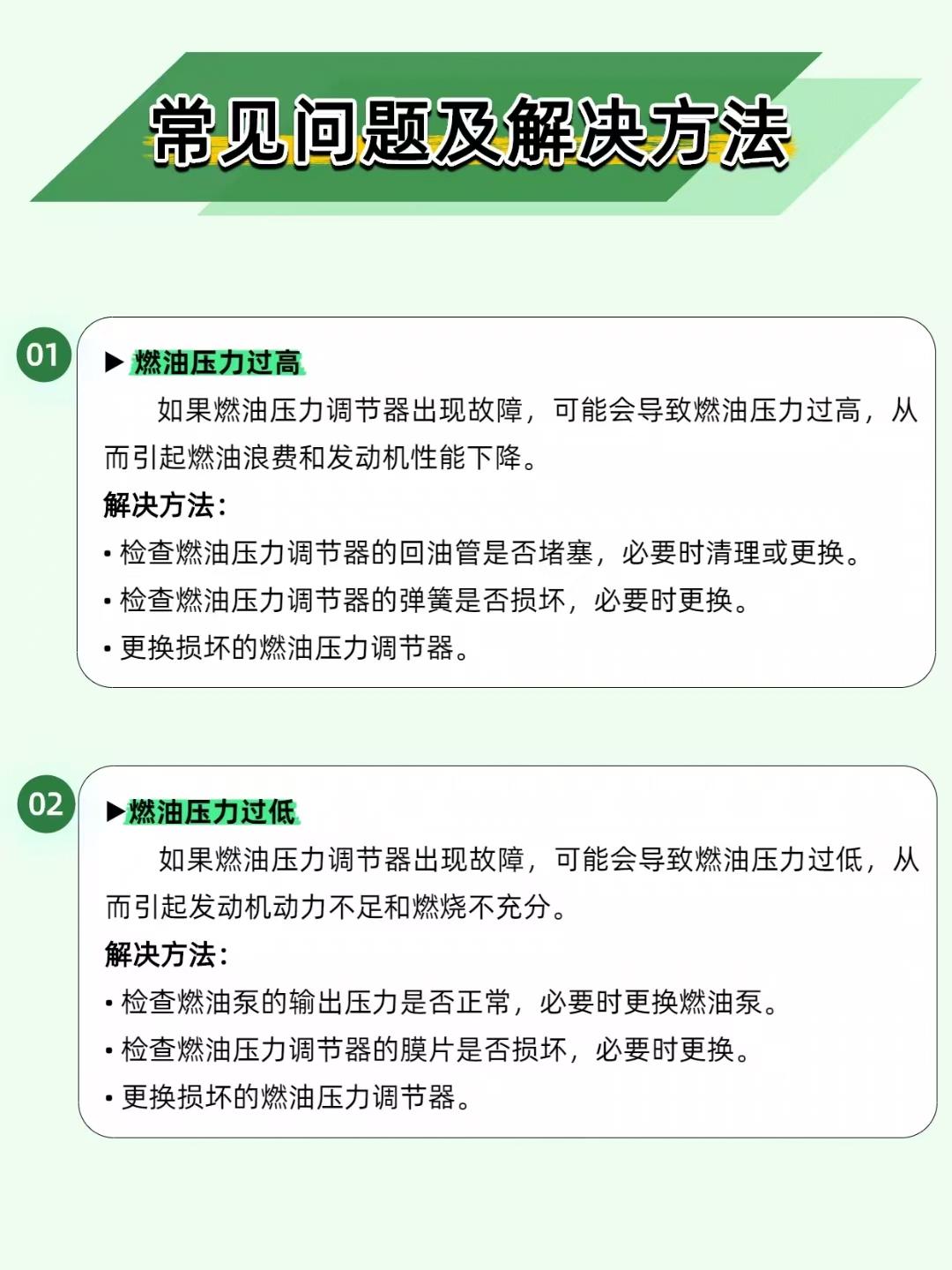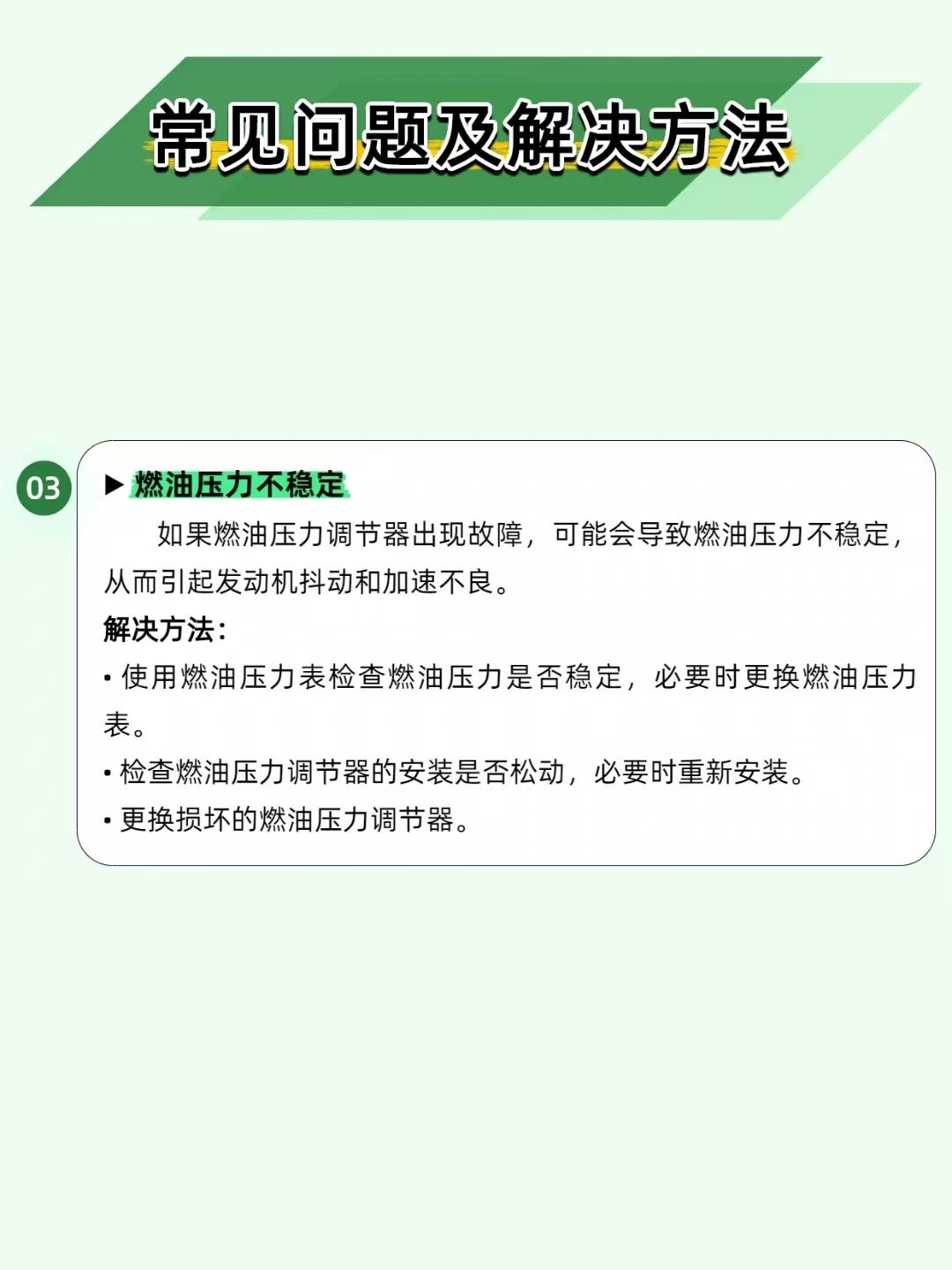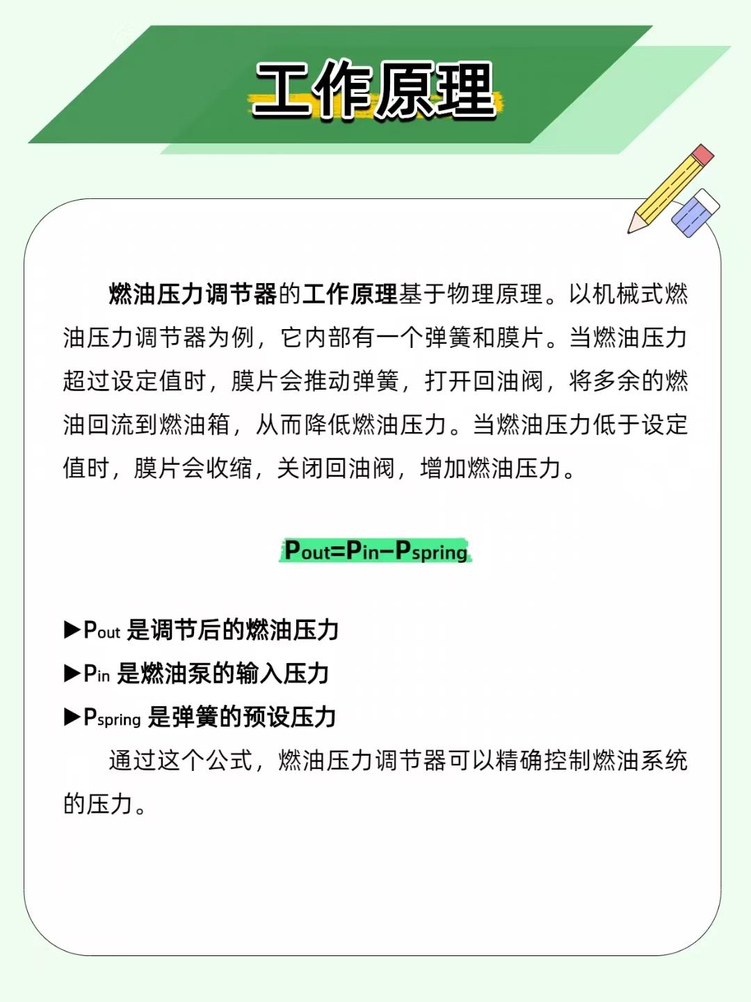 【油耗飙升、动力疲软?燃油压力调节器才是 “幕后管家”!】 汽车燃油系统里,燃油压力调节器就像个 “压力管家”—— 把燃油压力控制得稳稳的,发动机才能高效燃烧! ——————————————————————————————————————————— 🔧 两种类型,各有千秋 机械式:弹簧 + 膜片调节,成本低、耐用,家用车标配; 电子式:电子信号精准控压,适配高性能车,就是维修成本高。 ——————————————————————————————————————————— ⚙️ 工作原理很简单 机械式靠 “弹簧 + 膜片”:压力高了,膜片推开回油阀,多余燃油流回油箱;压力低了,膜片收缩关阀升压。公式总结:调节后压力 = 输入压力 - 弹簧预设压力,一目了然~ ——————————————————————————————————————————— ⚠️ 3 种故障要警惕 压力过高→油耗暴涨、动力下降→查回油管是否堵塞、弹簧是否损坏; 压力过低→动力疲软、燃烧不充分→查燃油泵、膜片是否损坏; 压力不稳→发动机抖动、加速无力→用压力表检测,检查安装是否松动。 ——————————————————————————————————————————— 📌 维护牢记 3 点 每 1-2 万公里检查调节器状态; 定期清理 / 更换回油管; 每 2-3 万公里换燃油滤清器,保持燃油清洁。 你的车有过动力弱、油耗高的情况吗?评论区聊聊~
