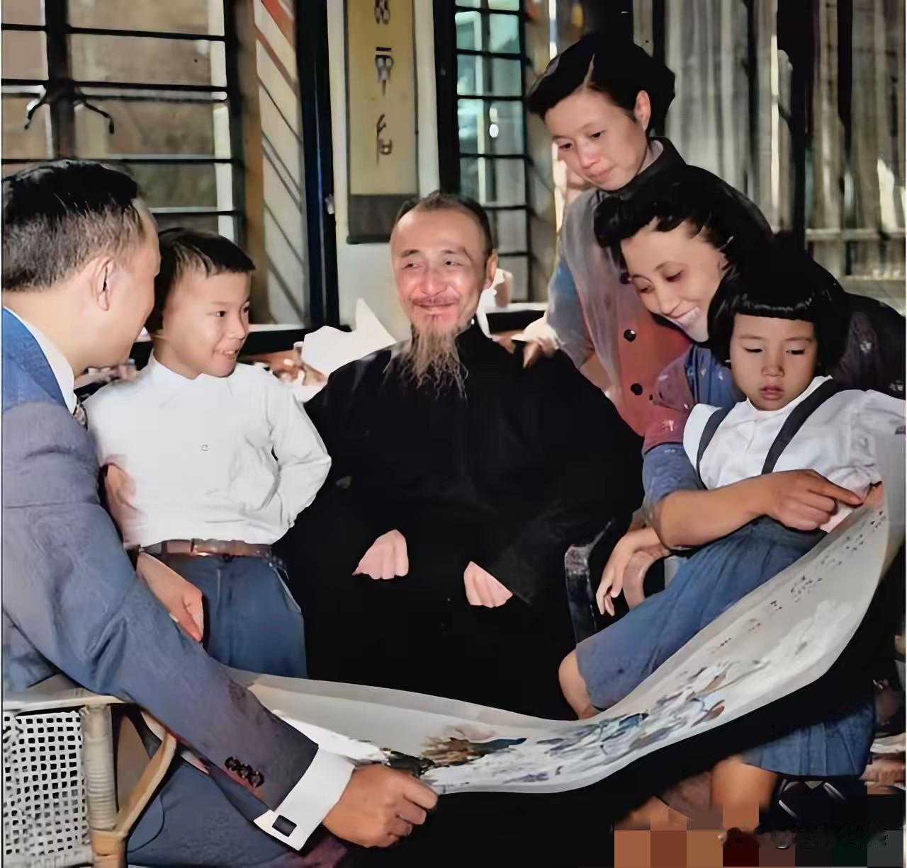 钱学森携妻带子回家看父亲,时间是1955年,看得出来,他老父亲的精神状态非常好,慈祥的看着儿子,一家人其乐融融,非常的温馨。钱学森的父亲也非常的了不起,也是一个非常有学问的人,正是因为如此,才培养一个这么优秀的儿子。这张照片非常的经典,有老人,有孩子,有一幅展开的画卷,充满了温馨祥和的气息!