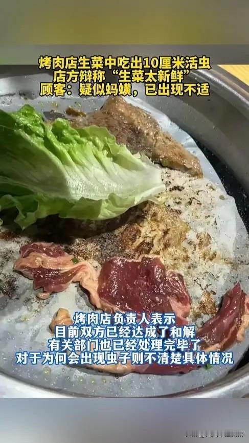 “太缺德了!”近日,广东广州,一女子和朋友吃烤肉,正吃着,朋友突然感觉嘴里的味道怪怪的,吐出来一看,竟发现一条10厘米长的虫子在蠕动!二人瞬间没了胃口,朋友还出现恶心、腹痛等症状。网友:商家难逃其咎! 那股难以形容的诡异触感,让于女士的朋友当场愣住。她从嘴里扯出来的是一条深褐色、仍在扭动的长虫,足足有10厘米,看着像蚯蚓,但颜色更深。盘子里剩下的生菜还粘在一起,这虫子很可能已经爬遍了整盘菜。 事后于女士把虫子的照片上传到AI识别软件,结果显示是“蚂蟥”。想到朋友是直接生食那片生菜,而她自己那份只是微微烤过,两人都感到一阵后怕。朋友不久后出现了恶心、焦虑和腹痛等不适反应。 店家的解释显得很苍白,因为“生菜太新鲜”,而且已经过盐水处理过了,但对于生菜中为何会出现虫子,负责人表示自己不在现场,不清楚具体情况。涉事烤肉店的负责人后续回应称,双方已达成和解,相关问题已由有关部门处理完毕。 现在一些餐饮店的后厨卫生状况确实令人担忧,存在食材处理不当、卫生操作不合规等等一系列问题。消费者在外就餐,最基本的期待就是食品安全卫生。 希望所有餐饮商家真正把顾客的健康放在心上,严格落实每一项卫生操作流程,商家信誉的建立需要长久努力,但一次疏忽就可能让其受损。 各位读者你们怎么看?欢迎在评论区讨论。