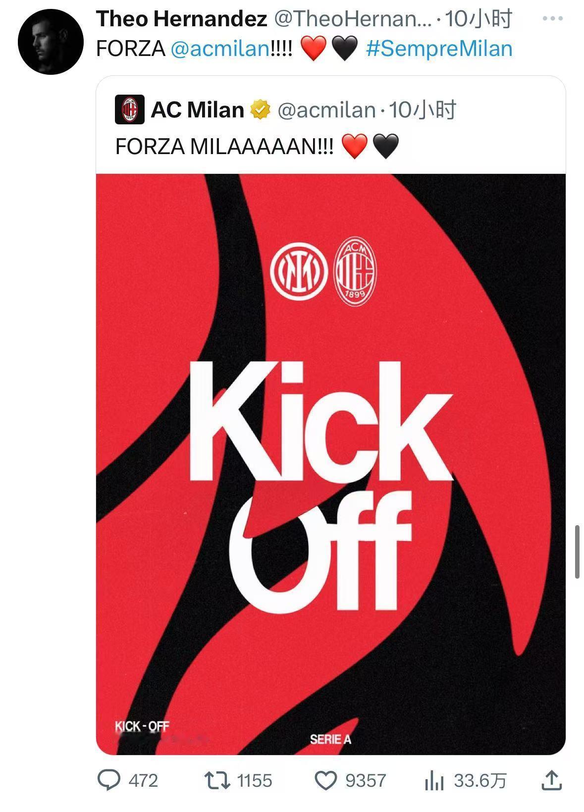 特奥想家了! 在米兰德比结束后,米兰前球员特奥第一时间祝贺了自己的老东家,看的出