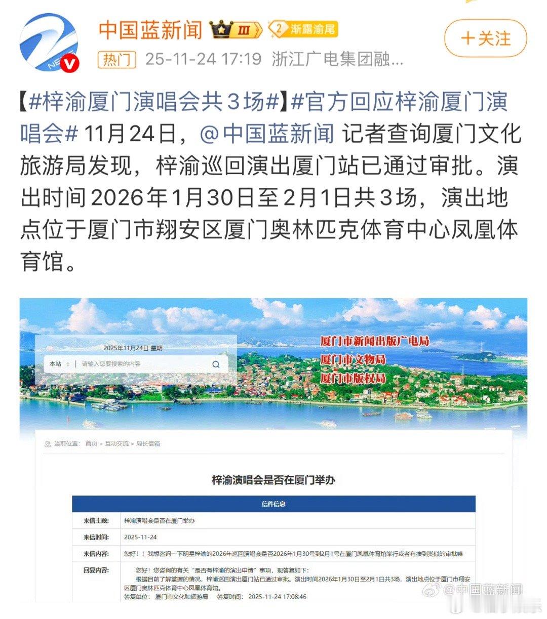梓渝巡回演唱会厦门站已审批通过,1月30日至2月1日连开三场,坐等官宣!期待梓渝演唱会!