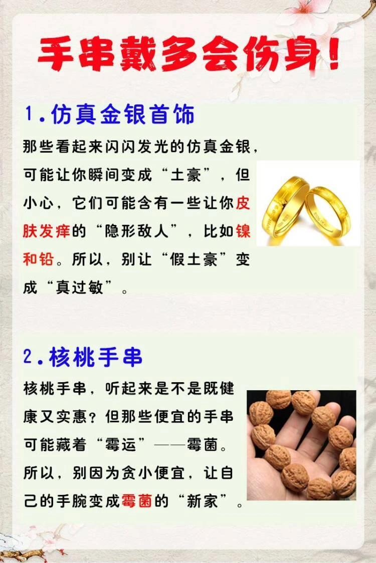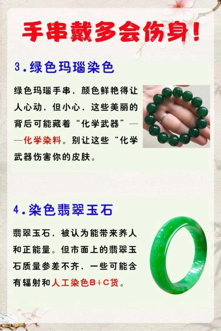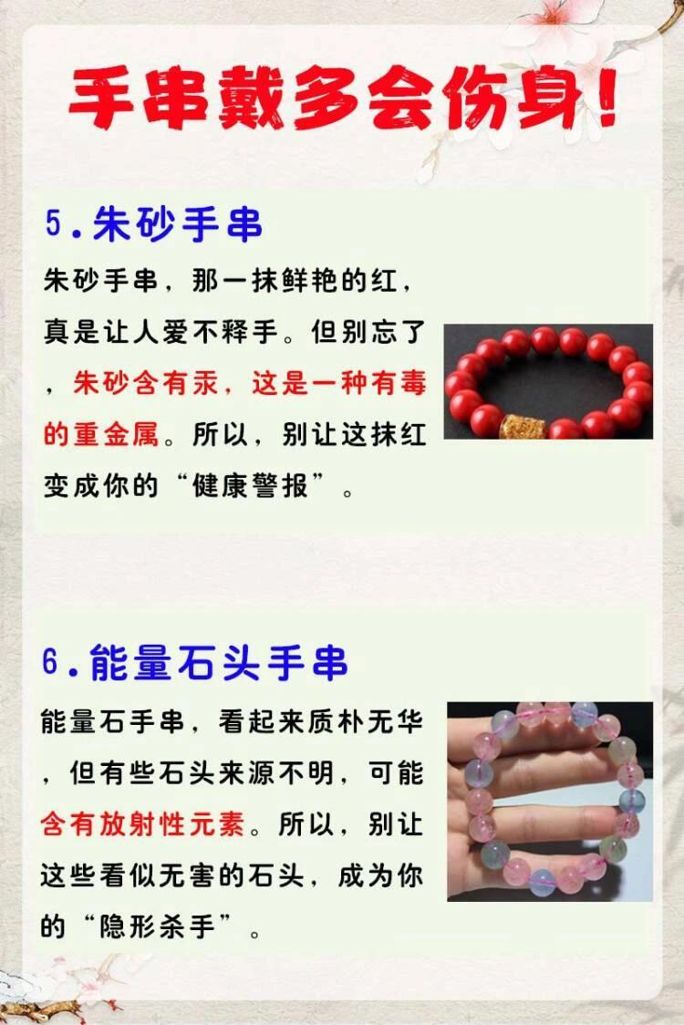 仿真手链 有害重金属千万别戴有害手串,这六种手串快看看自己手上有没有吧‼️💥1.仿真金银首饰那些看起来闪闪发光的仿真金银,可能让你瞬间变成“土豪”,但小心,它们可能含有一些让你皮肤发痒的“隐形敌人”,比如镍和铅。所以,别让“假土豪”变成“真过敏”。💥2.核桃手串核桃手串,听起来是不是既健康又实惠?但那些便宜的手串可能藏着“霉运”——霉菌。所以,别因为贪小便宜,让自己的手腕变成霉菌的“新家”。💥3.绿色玛瑙染色绿色玛瑙手串,颜色鲜艳得让人心动,但小心,这些美丽的背后可能藏着“化学武 器”——化学染料。别让这些“化学武 器伤害你的皮肤。💥4.染色翡翠玉石翡翠玉石,被认为能带来养人和正能量。但市面上的翡翠玉石质量参差不齐,一些可能含有辐射和人工染色B+C货。💥5.朱砂手串朱砂手串,那一抹鲜艳的红,真是让人爱不释手。但别忘了,朱砂含有汞,这是一种有☠️的重金属。所以,别让这抹红变成你的“健康警报”。💥6.能量石头手串能量石手串,看起来质朴无华,但有些石头来源不明,可能含有放射性元素。