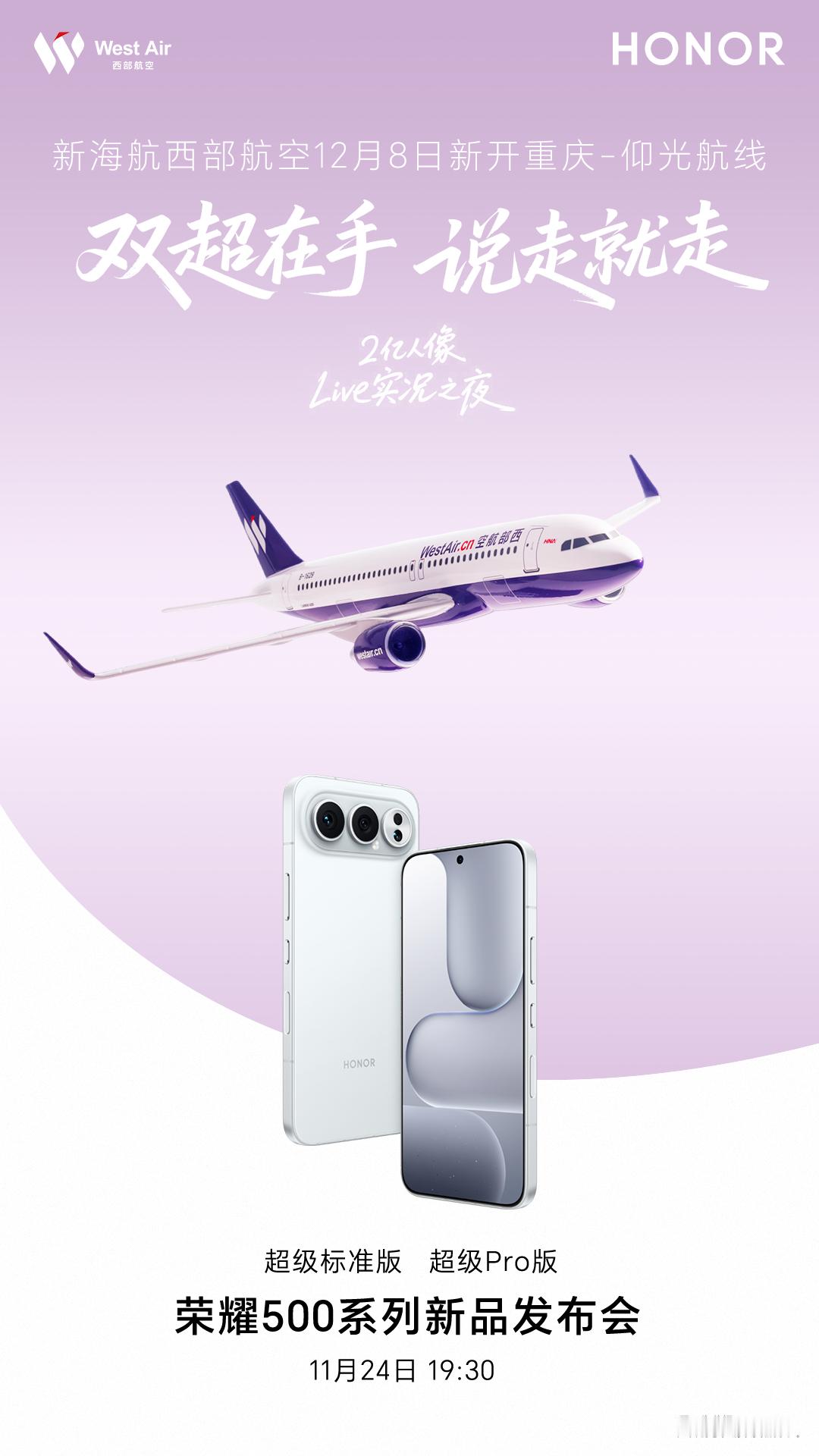 荣耀500系列产品这次整体都很有创意,好运水晶色,再加横向镜头模组,全新外观让人眼前一亮。影像也是突破性的带来人像实况功能,live图也能实现人像美颜,还和航司一起搞联名,超级标准版和超级经济舱,“双超”联合让体验更加轻松自如。