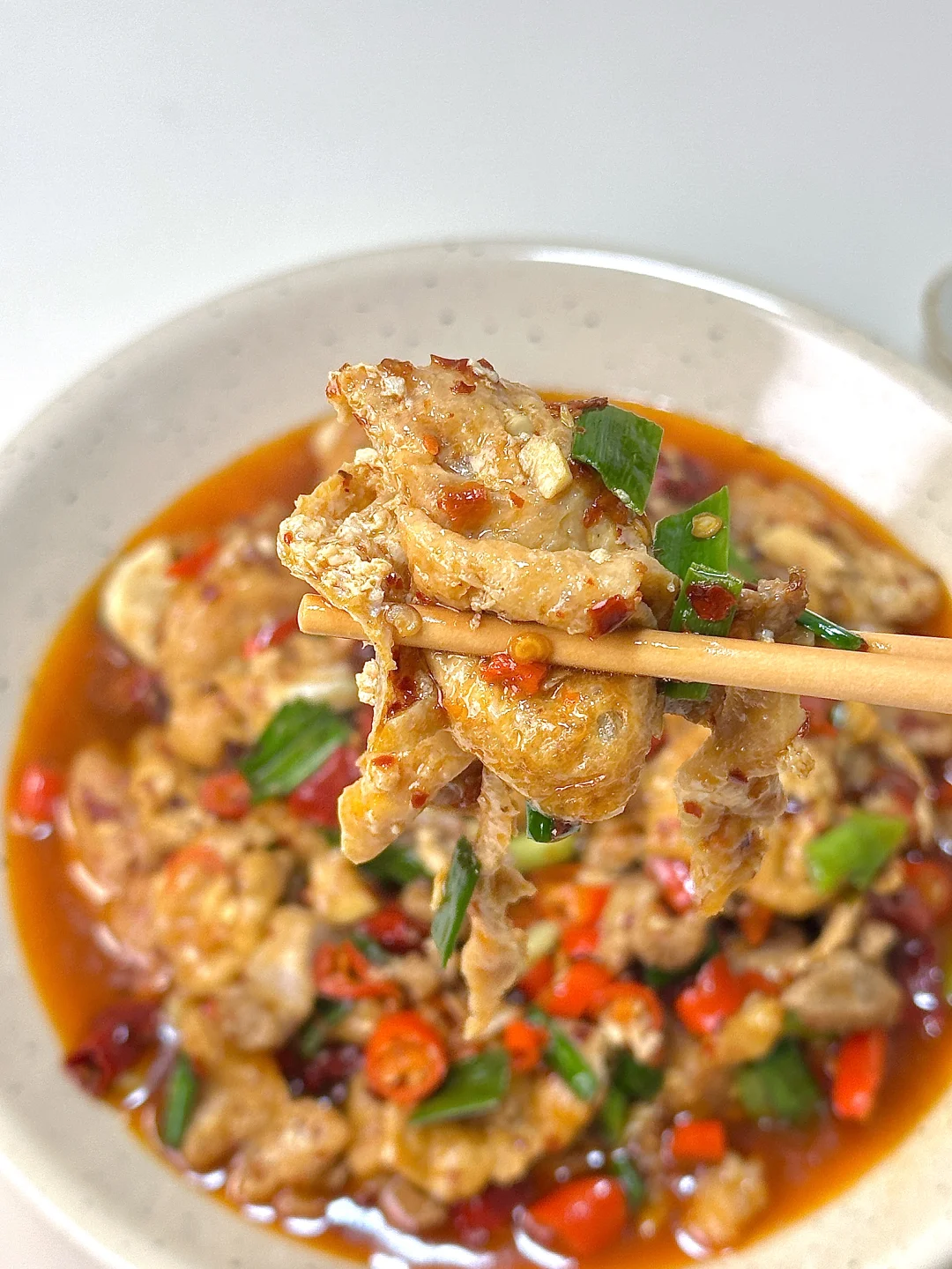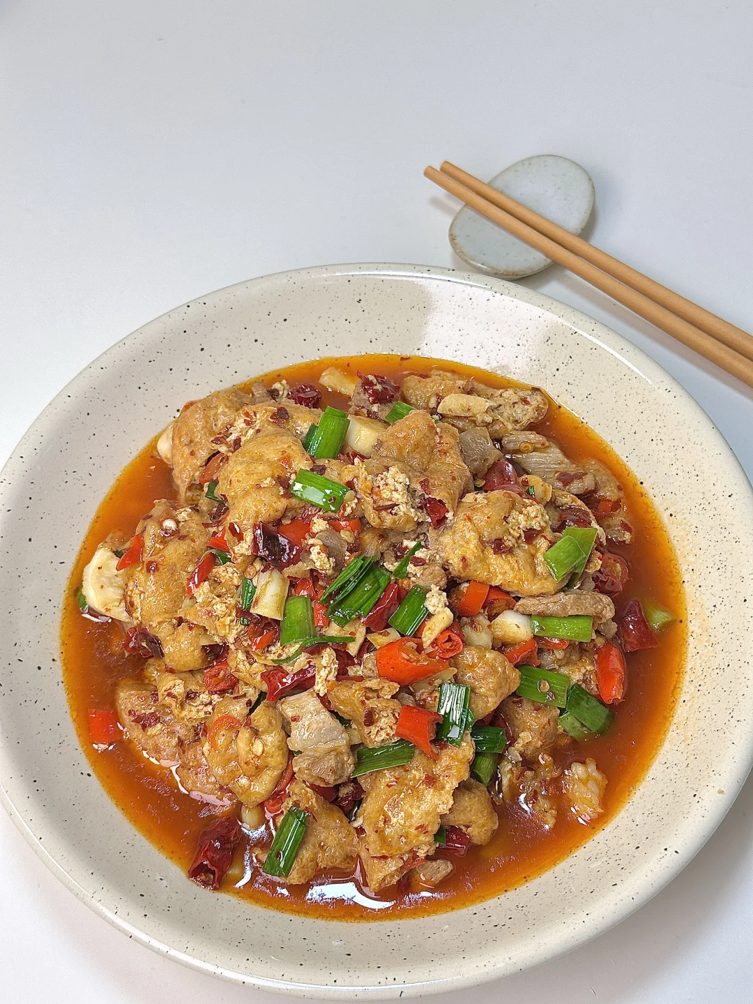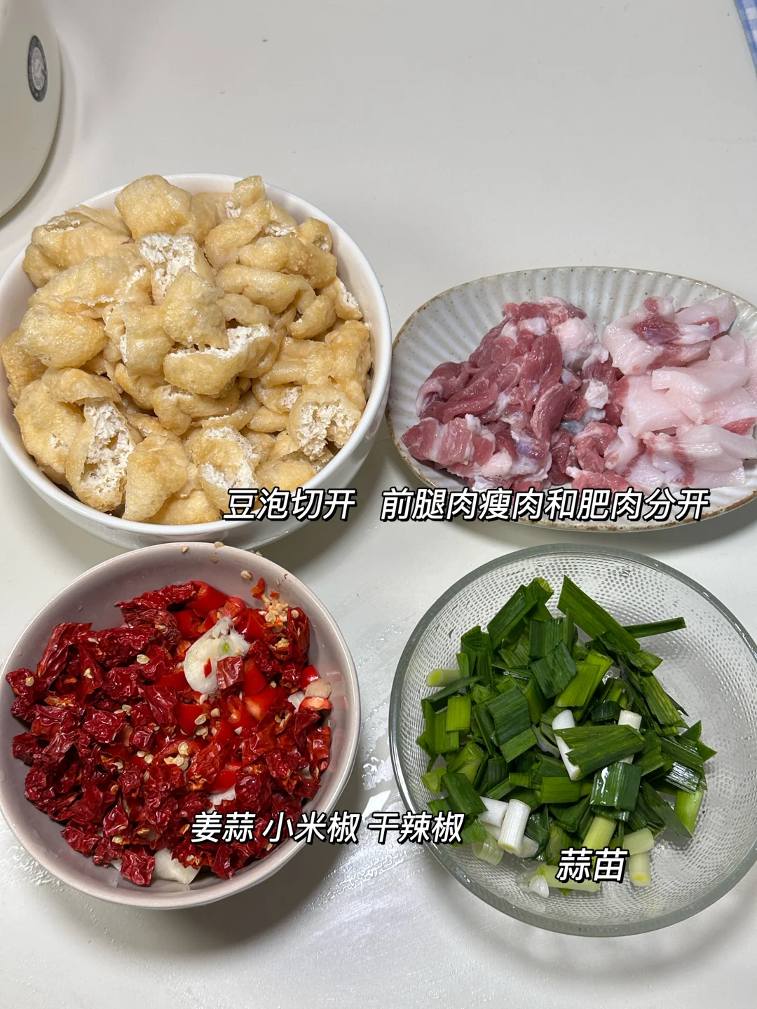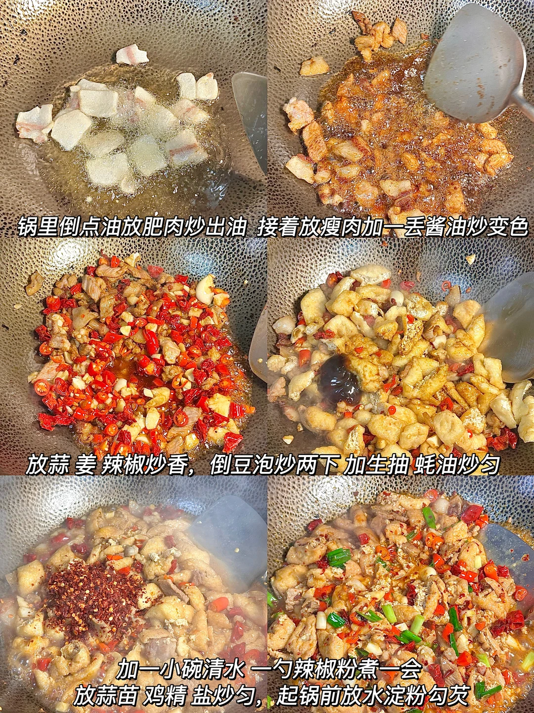豆泡炒肉,谁吃不迷糊啊🤤豆泡切开后煮的更入味,又鲜又辣!! ✨食材:豆泡 前腿肉或梅花肉 蒜苗 姜蒜 小米椒 干辣椒 1️⃣:锅里倒点油下肥肉炒出油脂,再倒瘦肉加一丢酱油炒上色炒干水气,放姜蒜 小米椒 干辣椒炒香,接着放豆泡炒两下,调味加生抽 蚝油炒香。 2️⃣:放一小碗清水、辣椒粉煮一会,接着放蒜苗 一丢盐 鸡精炒几下,淋水淀粉勾芡。 好好吃饭呀🖖🏻