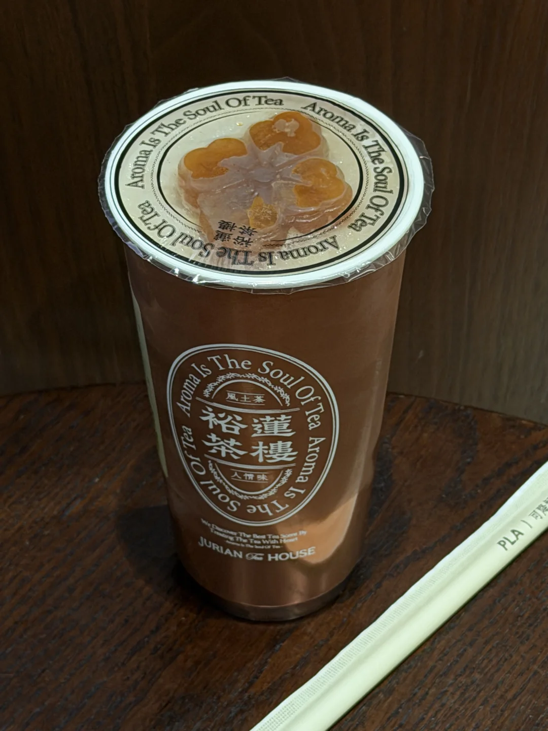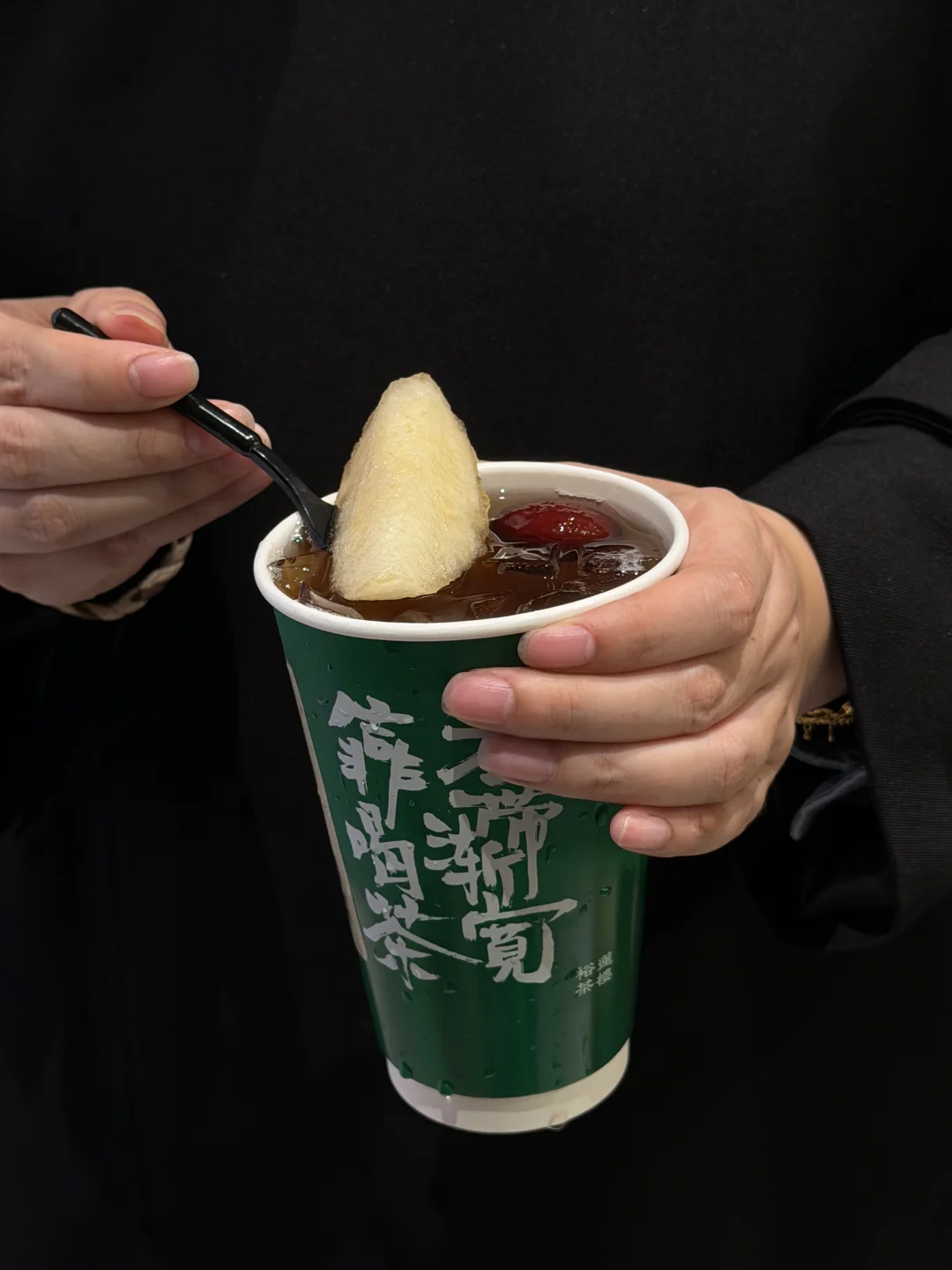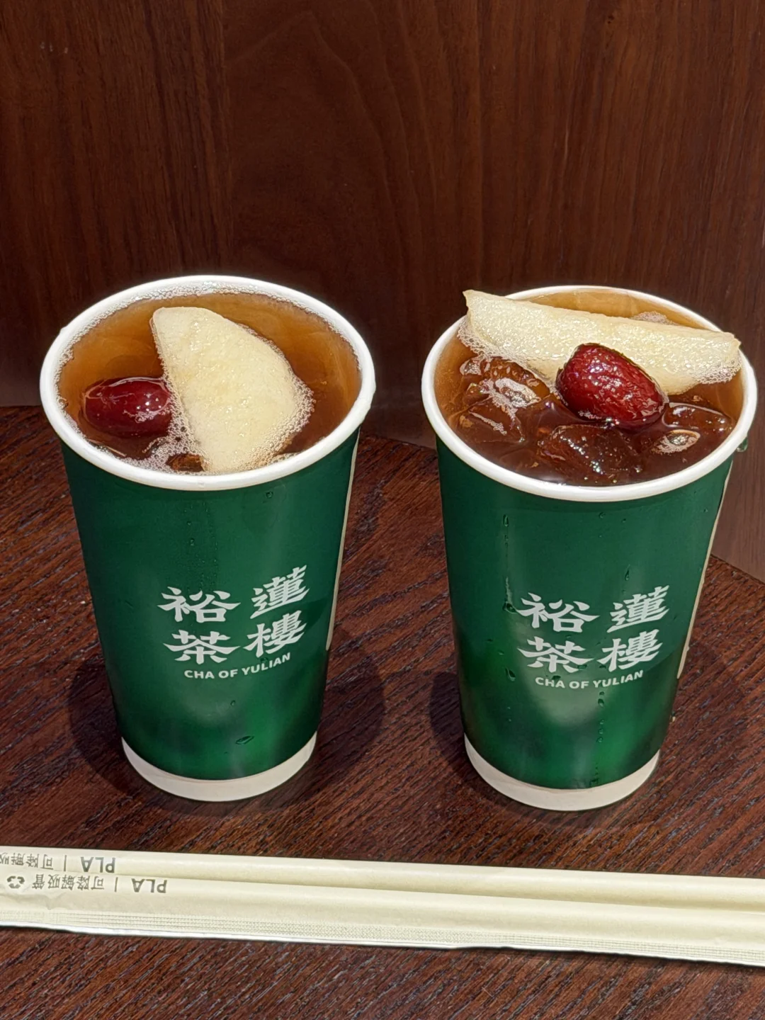 啊啊啊真的有被裕莲茶楼这两杯惊艳到!!! 青柑秋梨琥珀冰(金杯):一定要把顶部茶钻大力摇开!!!酸酸甜甜的,青柑果味儿我真的好爱!!里面的小料也很足!每一口都能喝到脆脆的梨丁和弹弹的梨冻! 秋月枣梨大红袍(绿杯)热的太适合冬天啦!!里面还有一整块梨和红枣!太养生了!!! 这两杯微微糖都很可!!!