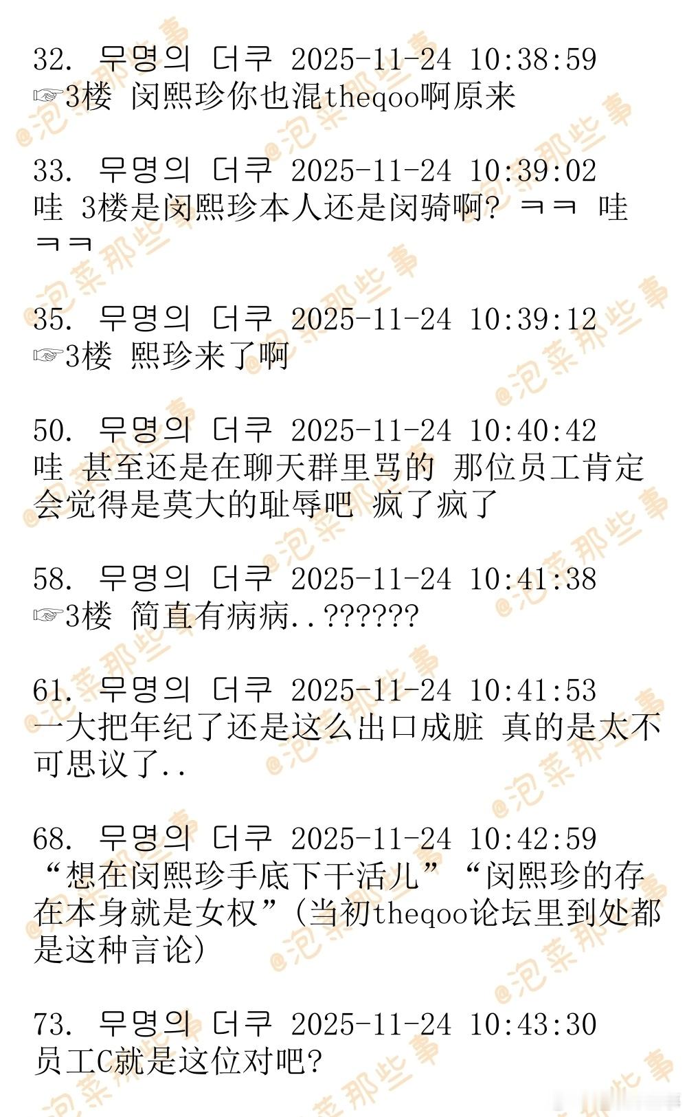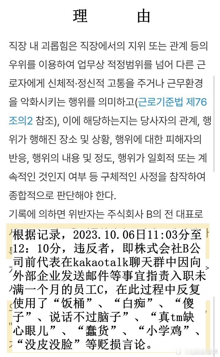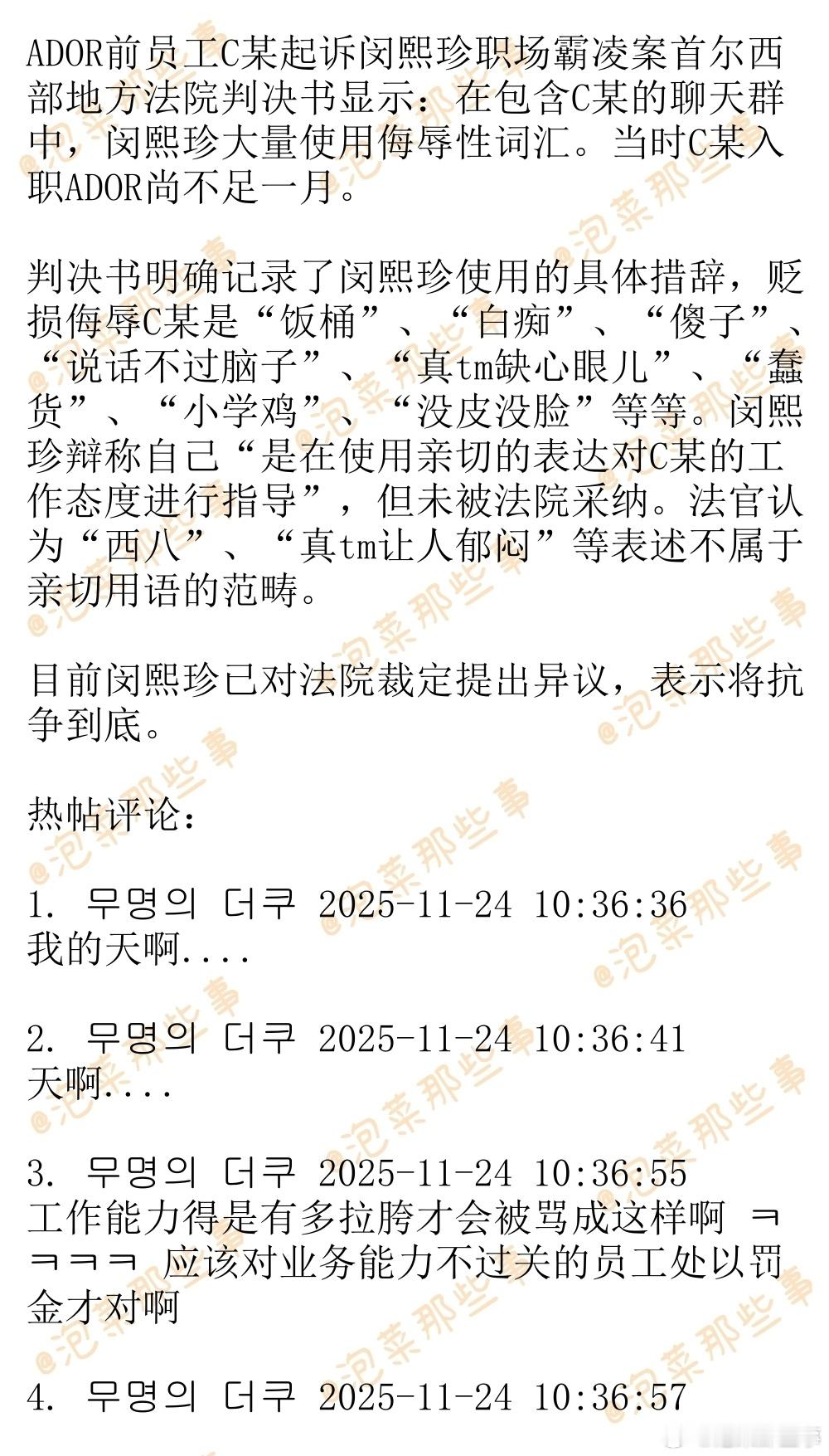 🔥🔥韩网600楼热帖评论翻译🔥🔥ADOR前员工C某起诉闵熙珍职场霸凌案首尔西部地方法院判决书显示:在包含C某的聊天群中,闵熙珍大量使用侮辱性词汇。当时C某入职ADOR尚不足一月。判决书明确记录了闵熙珍使用的具体措辞,贬损侮辱C某是“饭桶”、“白痴”、“傻子”、“说话不过脑子”、“真tm缺心眼儿”、“蠢货”、“小学鸡”、“没皮没脸”等等。闵熙珍辩称自己“是在使用亲切的表达对C某的工作态度进行指导”,但未被法院采纳。法官认为“西八”、“真tm让人郁闷”等表述不属于亲切用语的范畴。目前闵熙珍已对法院裁定提出异议,表示将抗争到底。cr.theqoo