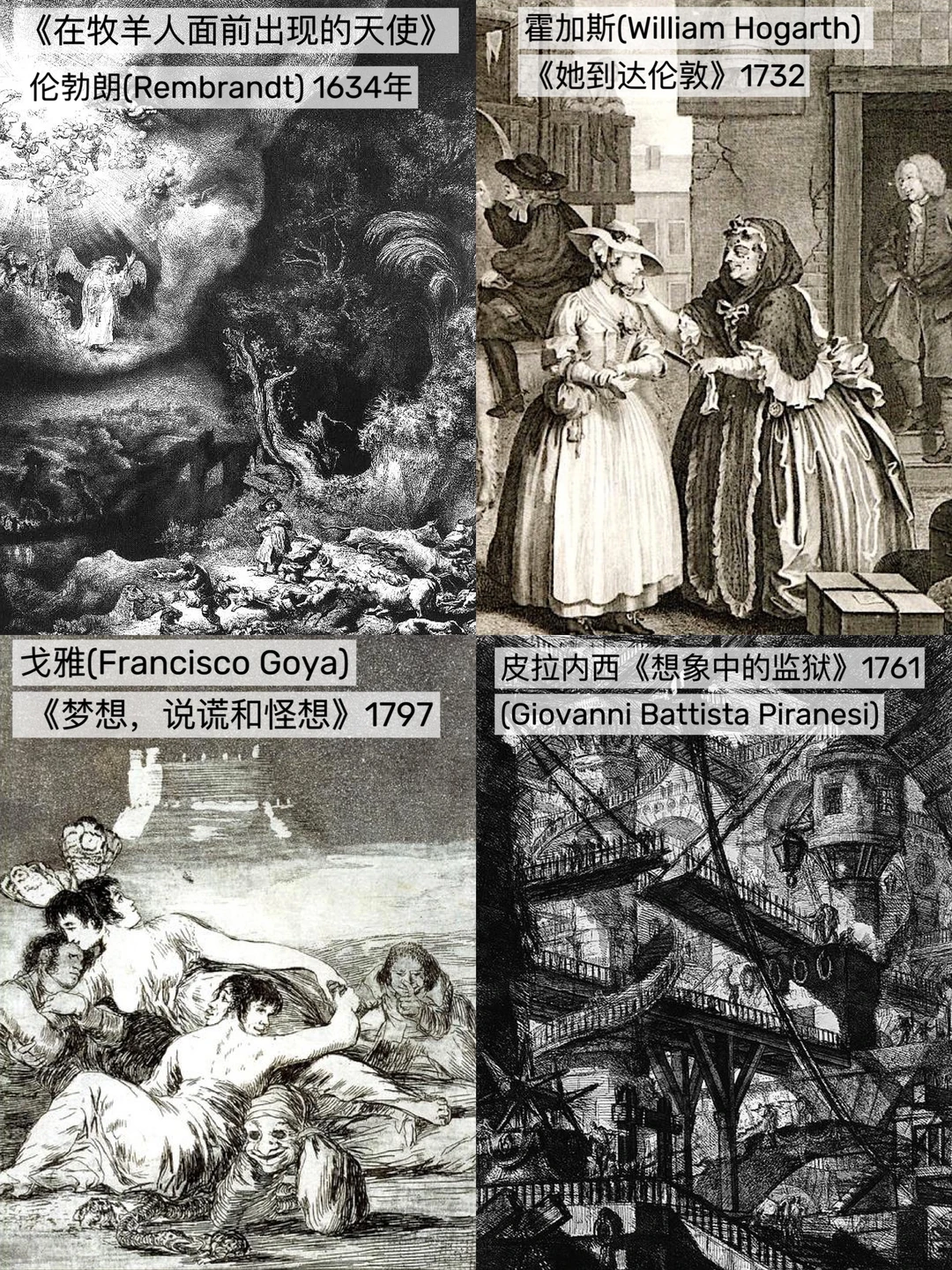 🔹17-18世纪在巴洛克和卡拉瓦乔风格影响下,画家们更加注重版画中的明暗变化,像善用光线的🌟伦勃朗、专注现实的🌟霍加斯、驰骋想象的🌟戈雅、热爱光影🌟皮拉内西,都是渲染细点飞尘、线面结合的高手。