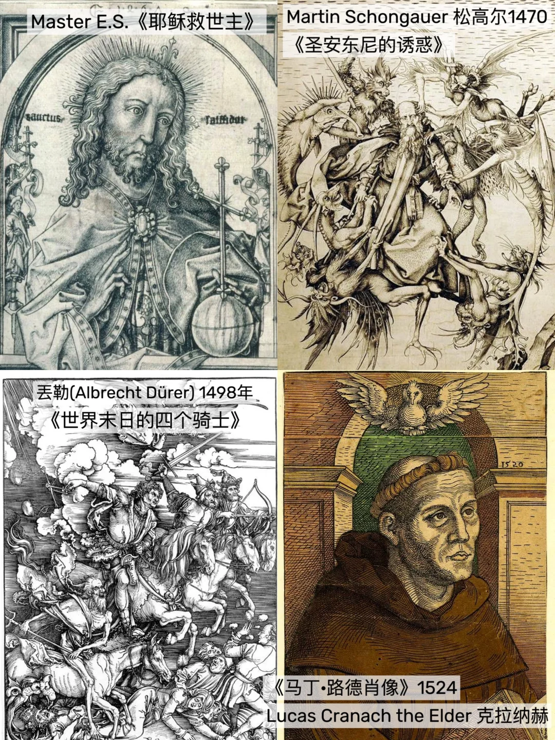 🔹在凸版、凹版、蚀刻技术并存的15、16世纪,诞生了许多大师级人物。开山鼻祖🌟E.S.采取金匠雕刻技巧,令画面线条深邃;