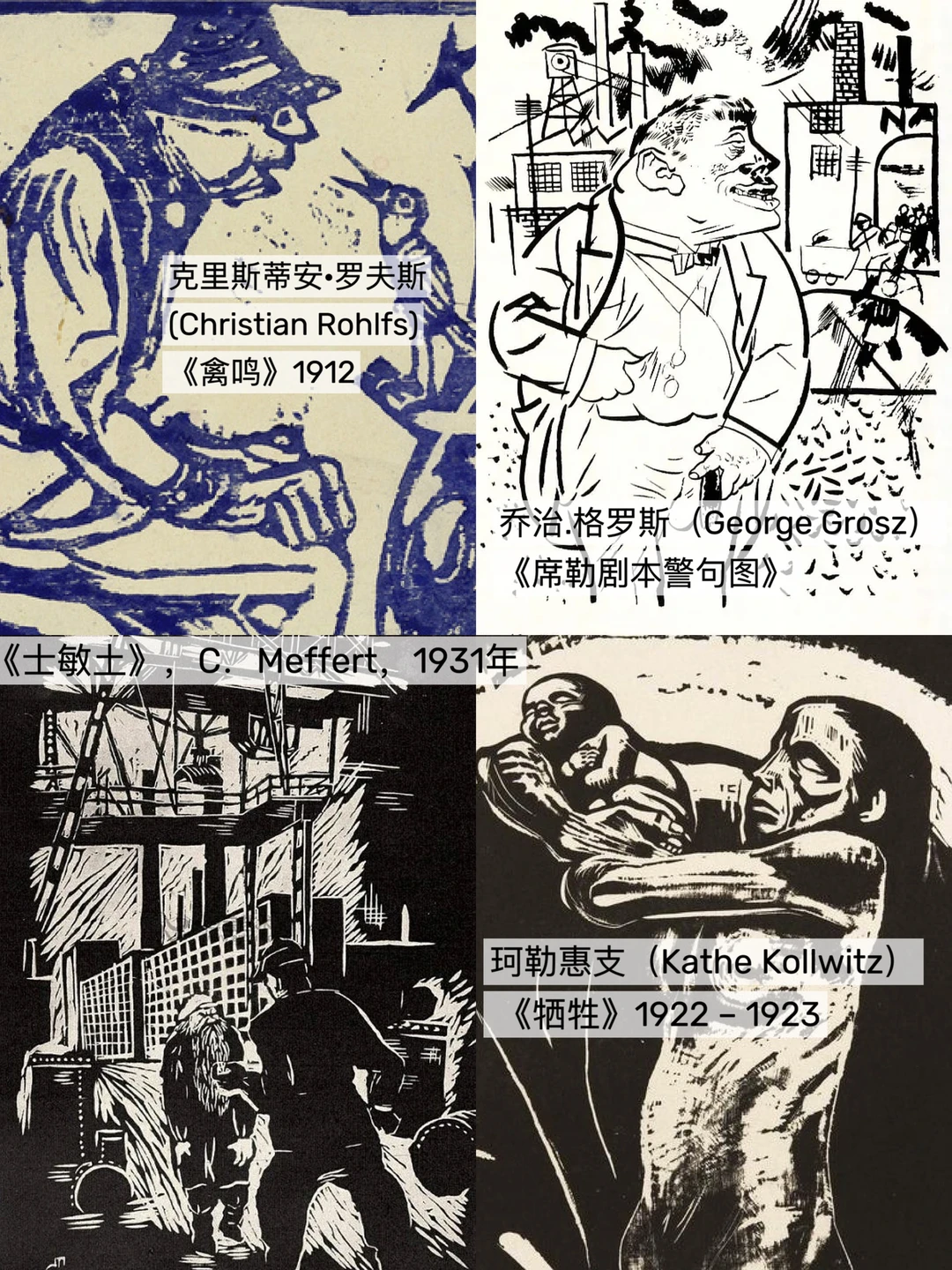 🔹尤其是蒙克饱含情感和冲击的笔触,造就了🌟德国表现主义、🌟新客观主义的兴盛,其中代表画家珂勒惠支、梅斐尔德、乔治.格罗斯、克里斯蒂安·罗夫斯等人,在战败笼罩的社会阴影中,坚持以版画为人民发声。