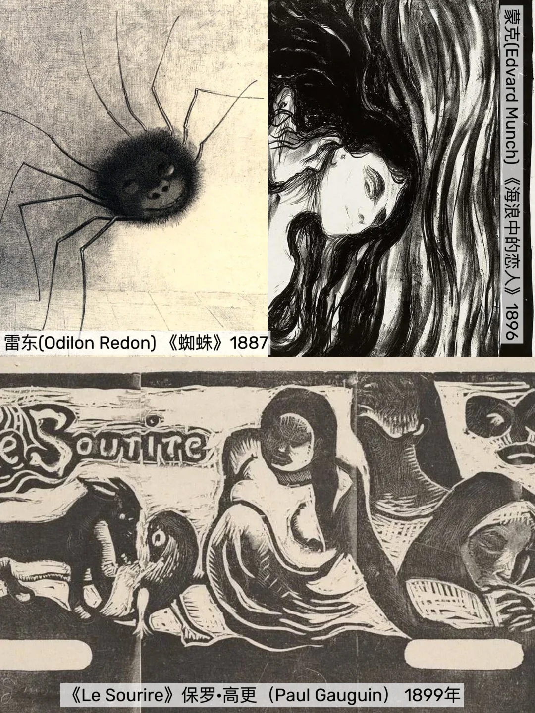 🔹到了19世纪中叶,日本浮世绘风靡欧洲大陆,这也直接影响了版画的发展,🌟印象派的马奈、德加,🌟后印象派的高更,🌟象征主义画派的雷东、蒙克,都将版画视为了艺术创作的一部分。