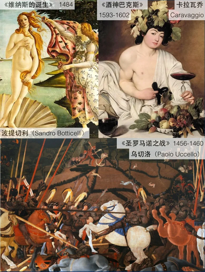 🔹首先是来自佛罗伦萨的乌菲齐美术馆,这里因收藏众多文艺复兴大师作品而闻名远扬。我们将看到保罗.乌切洛在《圣罗马诺之战》中建立新的透视方式;波提切利在《维纳斯的诞生》里回顾古希腊雕塑的唯美细腻;卡拉瓦乔在《酒神巴克斯》中展现脱离神性的世俗写照。