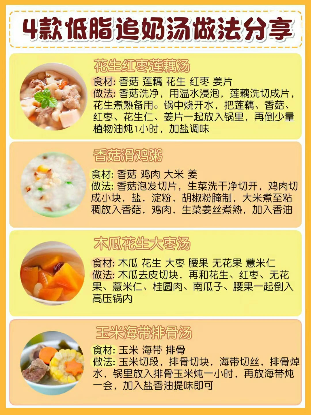 日常饮食可多喝下奶汤,做法已经在图片里写清楚啦,分享的4款都不算油腻的,新手妈妈不用担心长肉肉~