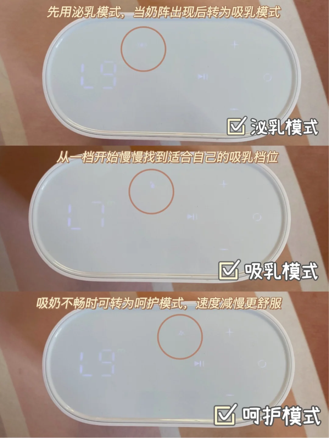我用的如山双边吸奶器有泌乳、呵护、吸乳的三种模式,每种模式下有9个档位可以调节,建议每次从一档开始往上加,方便找到适合自己的档位。吸奶前记得先开热敷,再开泌乳模式,最后开始吸奶。而且这款可以单边双边切换着使用,每次开机不需要重新调节档位,我觉得真是太方便了!